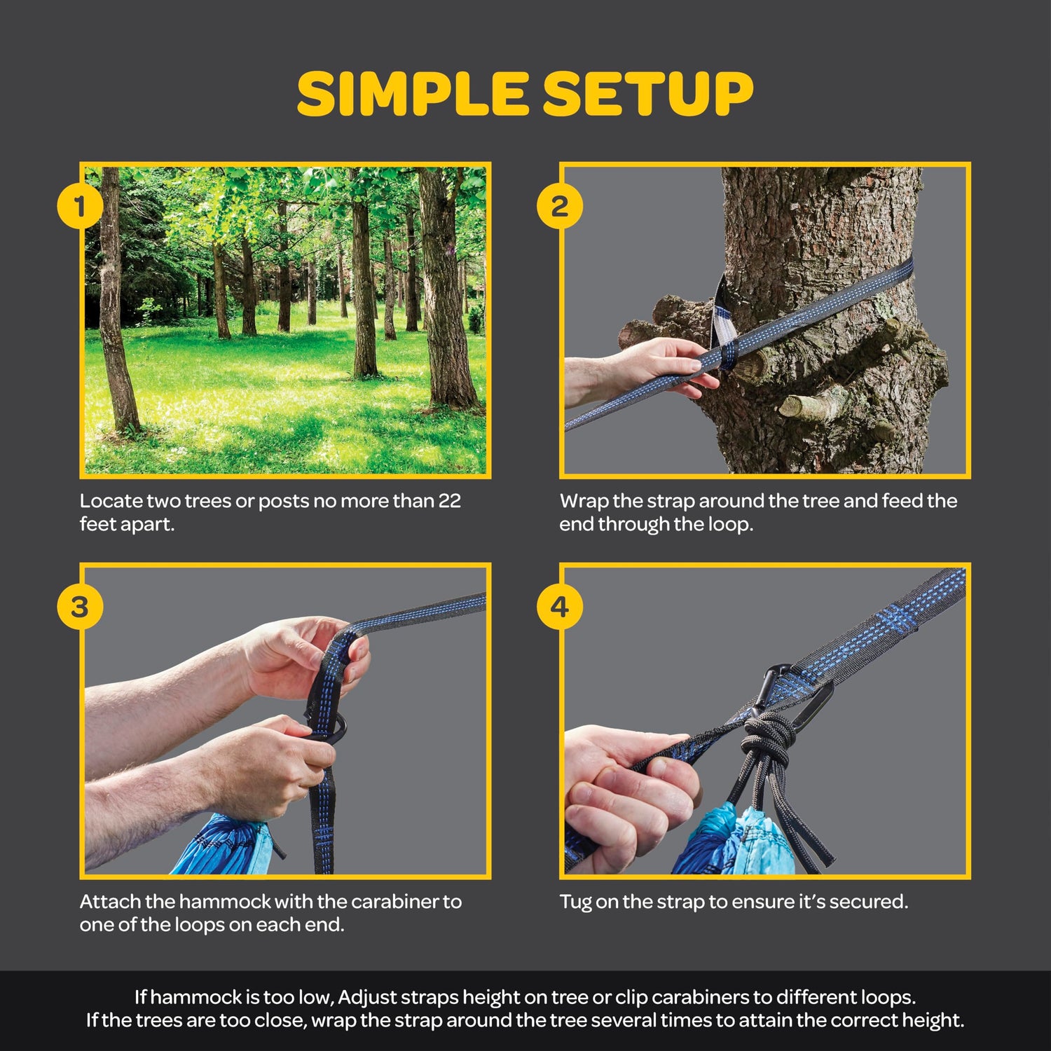 - EASY SETUP- Spend no more than 1–2 minutes setting up your hammock; all you need is included. Strap has 5 adaptable loops for adjusting seat height. Suspend the hammock 18 inches above the ground for the ideal experience.