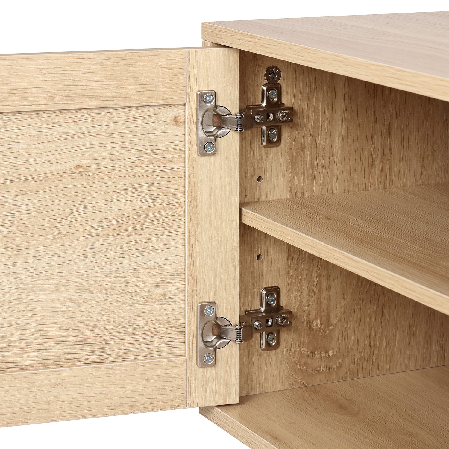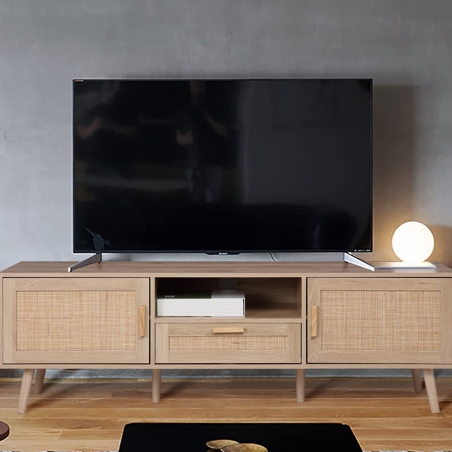 - MULTIFUNCTIONAL TV STAND - All-purpose wooden TV stand with 2 big rattan decor doors and a rattan hidden drawer creat a lot of extra storage space for your. It can meet your various storage needs in your living room. The nature color body and wood color doors combined retro and modern, it can be suitable for various styles of home decoration, adding a touch of unadorned elegance to your space.