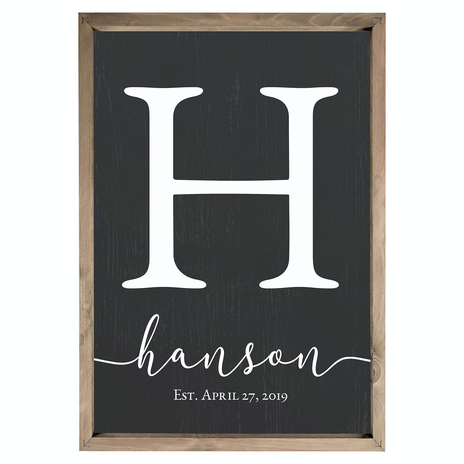 Framed Wooden Family Name Sign Personalized Wood Monogram Choose from Four Sizes (12" x 18", Weathered Grey Frame, Black Background)