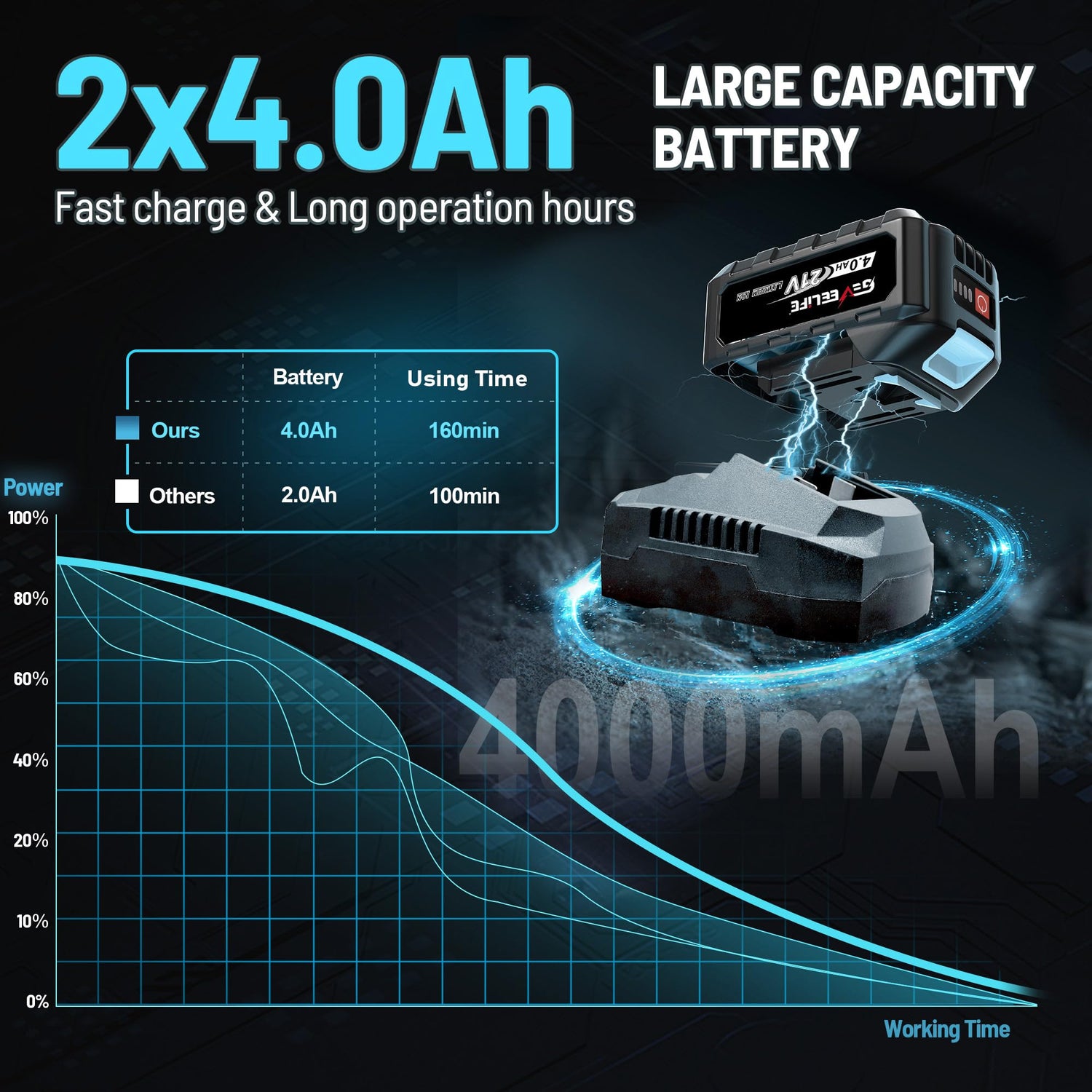 - 【2*4.0Ah Battery】With two 21V 4.0Ah batteries, the Geveelife 1/2" cordless impact gun offers extended battery life and longer usage time. Its wireless design allows for convenient use without the restrictions of cords. You can enjoy up to 160 minutes of continuous operation on a single full charge.
