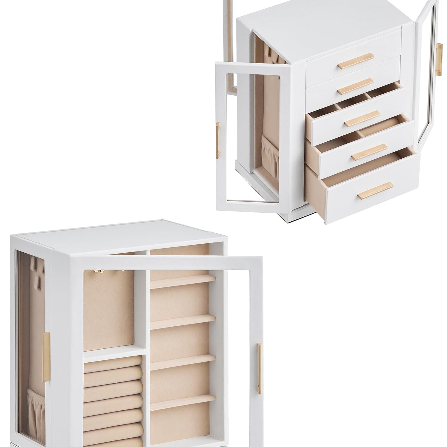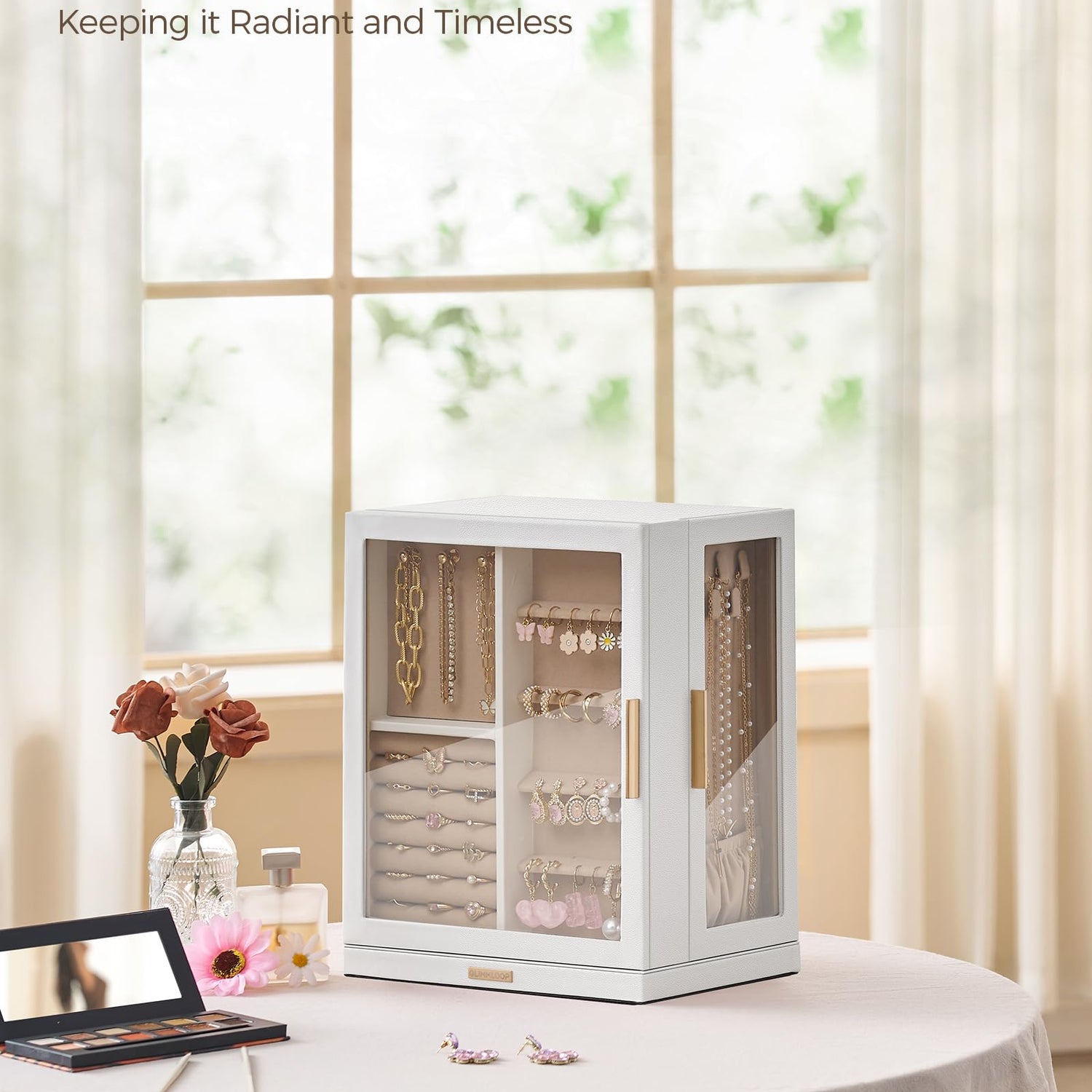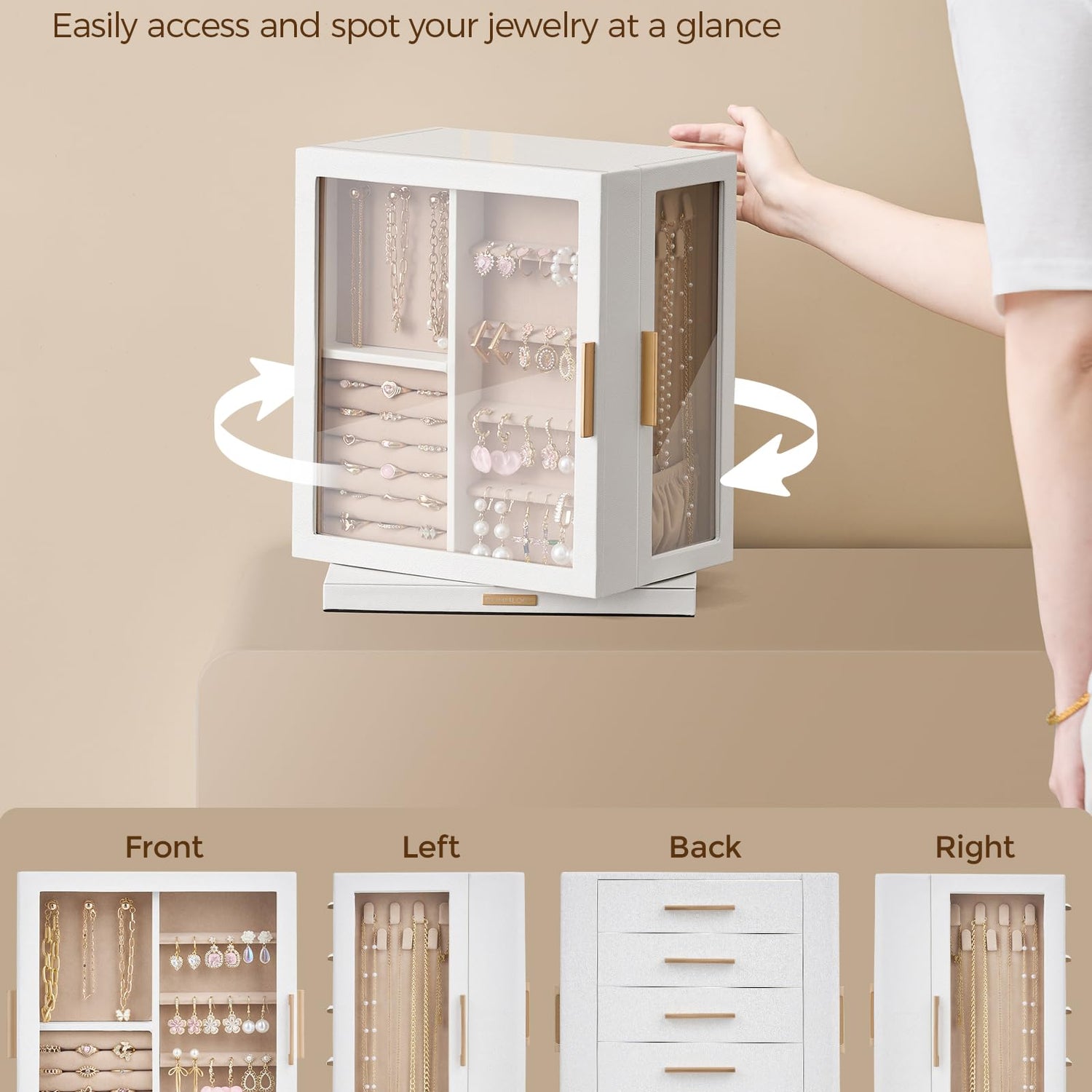 Glimmloop 360° Rotating Jewelry Box with 5 Drawers, Spacious Vertical Jewelry Organizer with Glass Window, Jewelry Storage Case, Dustproof & Moisture-resistant Design, White