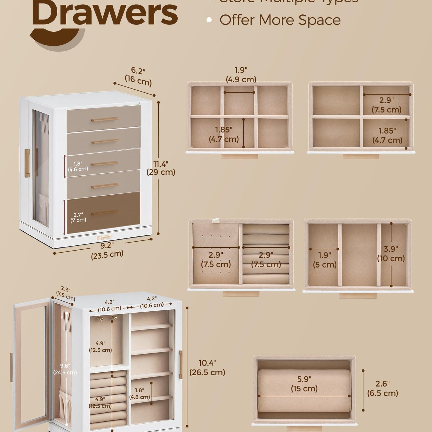 - 【Spacious Storage for All Jewelry Types】This jewelry box has everything you need for organized storage. It includes ring slots, earring holes, long necklace hooks, bracelet hooks, watch cushion, and 5 drawers–perfect for keeping earrings, rings, brooches, hair accessories, watches, and more neatly stored. Measuring 6.2"x9.2"x11.4".