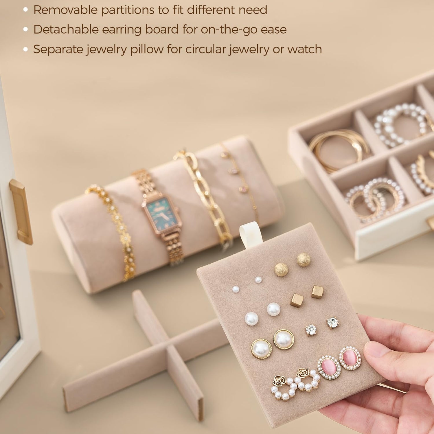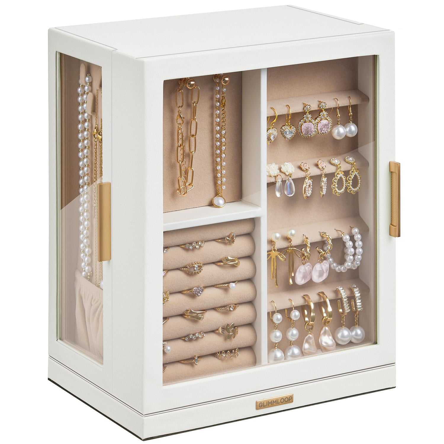 - 【Stylish & Versatile Use】With its white PU leather and matte gold hardware, this jewelry organizer adds a touch of elegance to any bedroom vanity, closet or livingroom. It’s not just for storage, it’s a beautiful decor piece for your home.