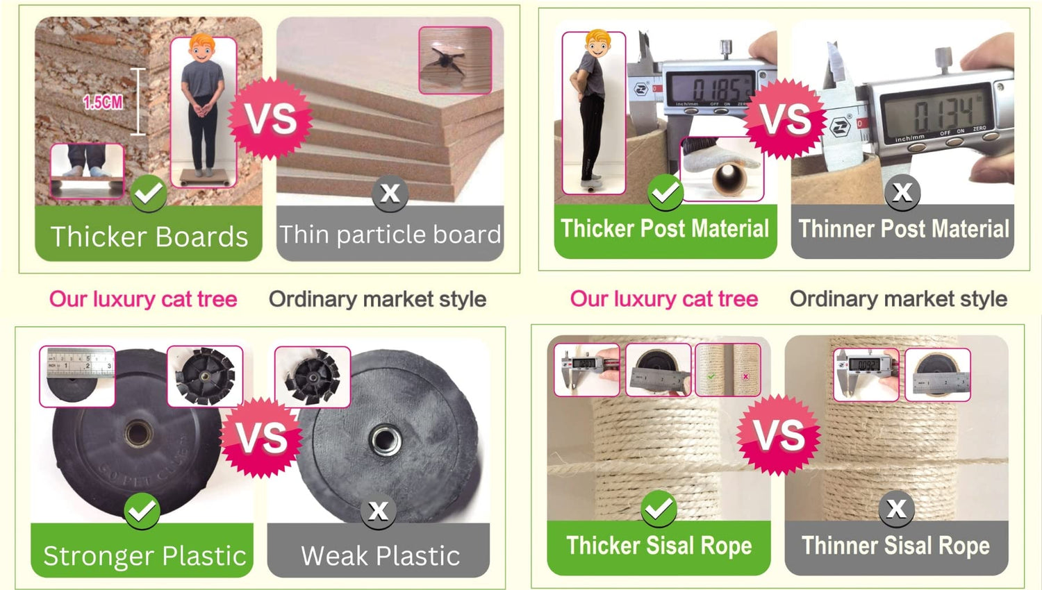 - Ultra-Durable: All scratching poles and boards are hand-glued with thick natural sisal ropes and skin-friendly plushy faux-fur fabrics, ensuring this cat tree tower withstands even the most aggressive scratchers