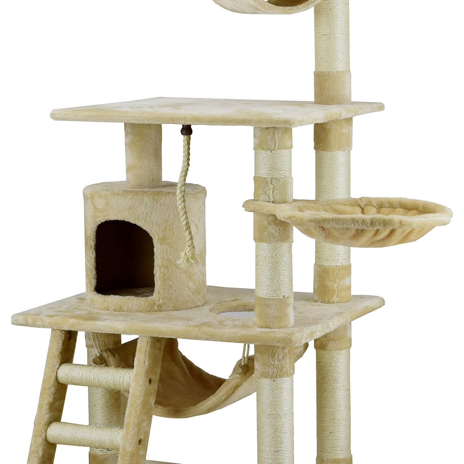 Details: This faux fur cat tree makes lounging and playing extra luxurious. Pamper your pet with this stylish yet functional piece complete with hammock, basket bed, ladder, tunnel, condo and more! Encourage your kitty to leap, lounge and perch on this all-in-one pet paradise. Entertain your adventurous cat for hours with multiple levels of fun. A tantalizing hanging toy incentivizes your kitty to climb higher while sisal-wrapped posts satisfy their natural instinct to scratch. Base Board Size : 19"L x 26"W Size of Condo : 10.5" Diameter x 12.5"H Size of Top Perch : 13.25"L x 13.25"W x 2.75"H