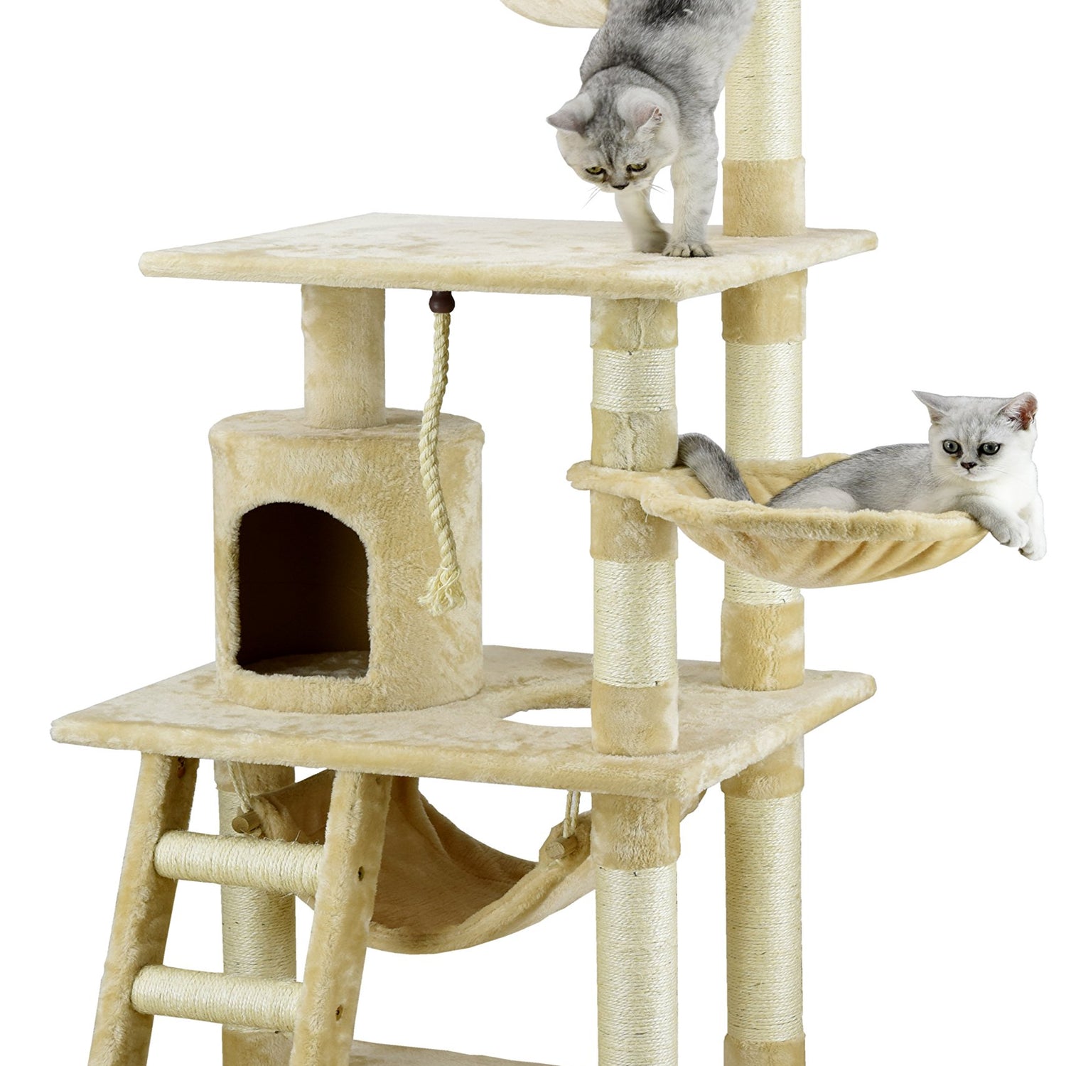 - Ultra-Durable: This cat tree is made from highly durable compressed wood with faux fur; multiple scratching posts are covered by natural sisal ropes, perfect for cats to scratch, climb, play, and become active