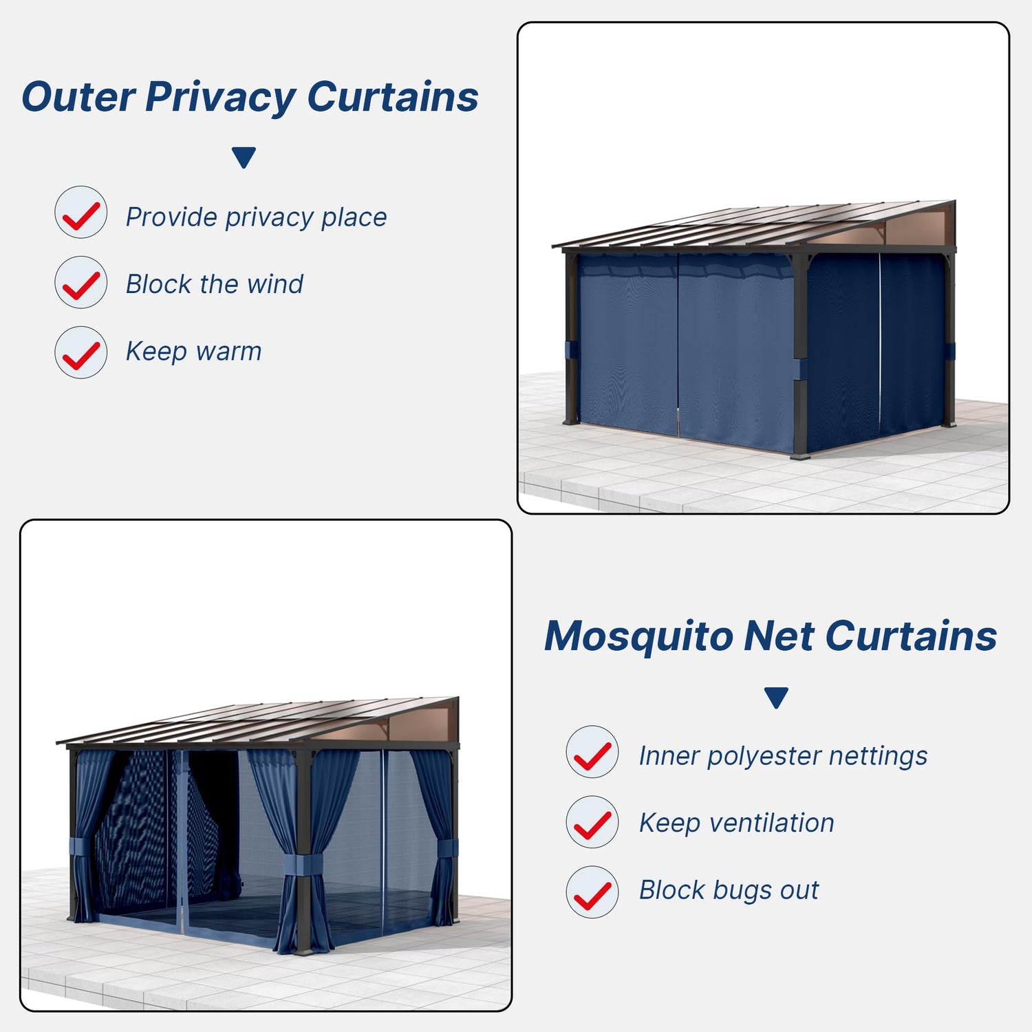 - Lean-to Gazebo:Designed with a sloping sun panel roof for optimal sun protection and effective water drainage.Includes double curtains to provide privacy and protection from insects and weather.