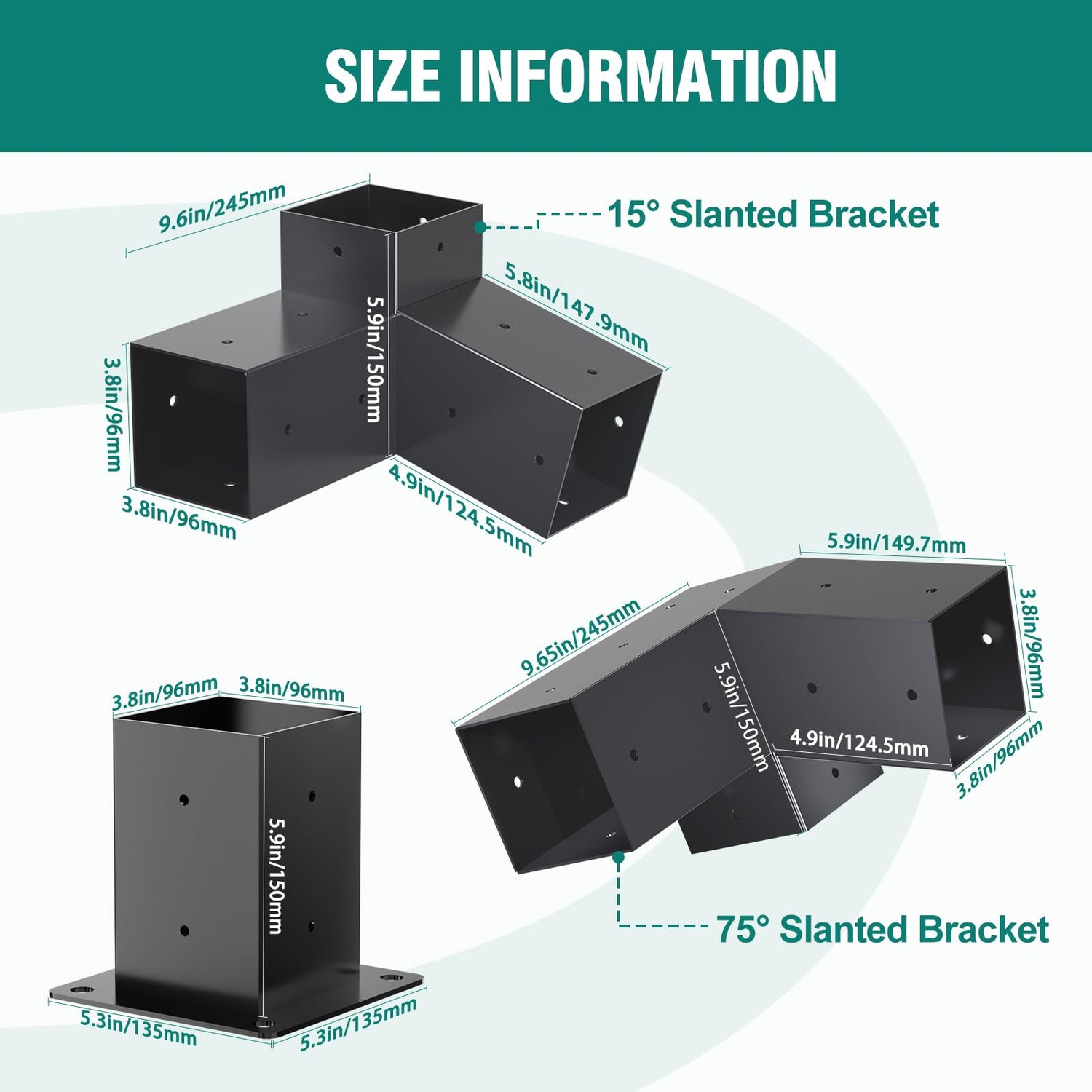 HAYOHRT 15° Pergola Brackets 75° Pergola Brackets Corner Bracket with Post Base Gazebo Kit for 4x4'' (Actual 3.5x3.5 in) Wooden Beams Lumber Gazebos Patio Pergola Sheds