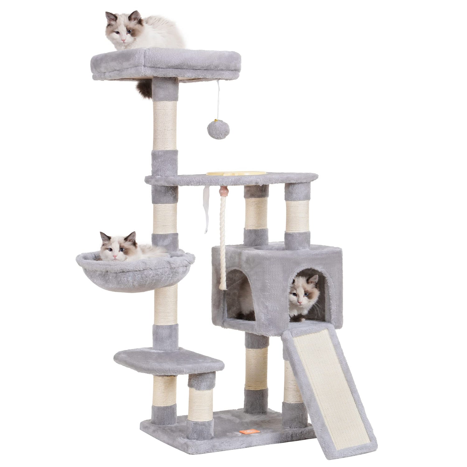 Heybly Cat Tree, Cat Tower for Indoor Cats with Scratching Board, Multi-Level Cat Furniture Condo with Feeding Bowl Light Gray HCT010SW