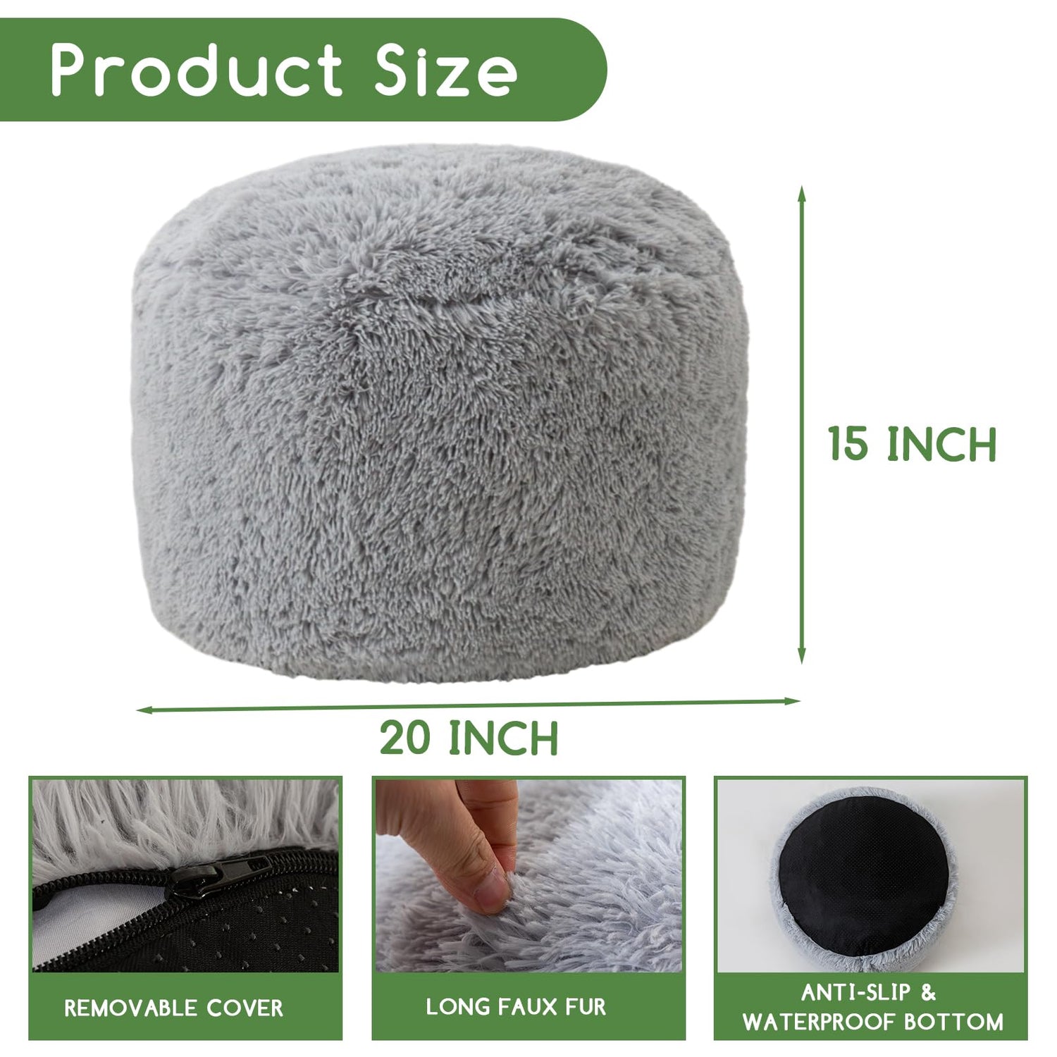 HIGOGOGO Round Stuffed Pouf Ottoman, Long Faux Fur Poufs with Foam Chunk Filling, Fluffy and Furry Pouf Foot Stool Storage Ottoman, 20 X 15 Floor Poufs Foot Rest for Living Room, Grey