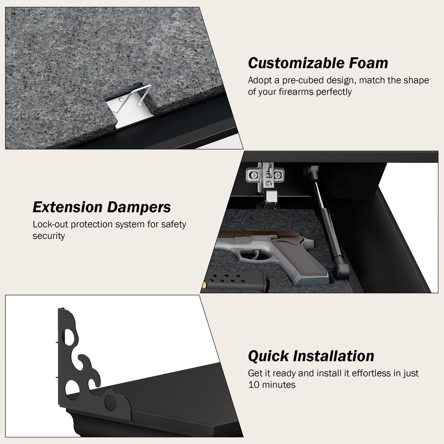 • 【Secret & Secure】 -Experience the ultimate peace of mind with HNEBC gun shelf. Sleek design allows for gun storage in plain sight, but the gun safe compartment shelf features a hidden magnetic key for locking, which adds security and convenience