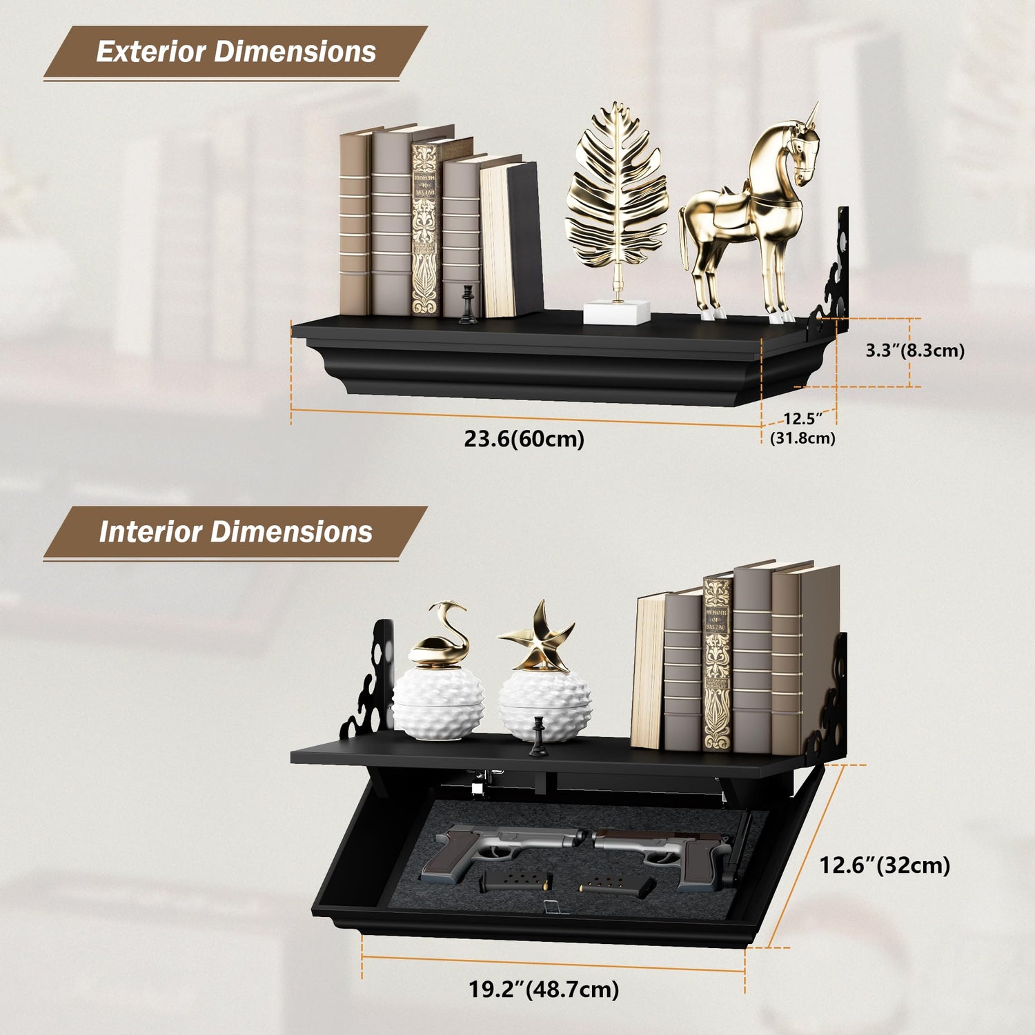 • 【Dimensions】 -The gun storage shelf is not just a secure place to store your firearms, but also a fully functional shelf. Measuring 23.6" x 12.6" x 3.3" exterior shelf with 19.2" x 12.6" x 3" interior compartment, it provides ample space for your valuables
