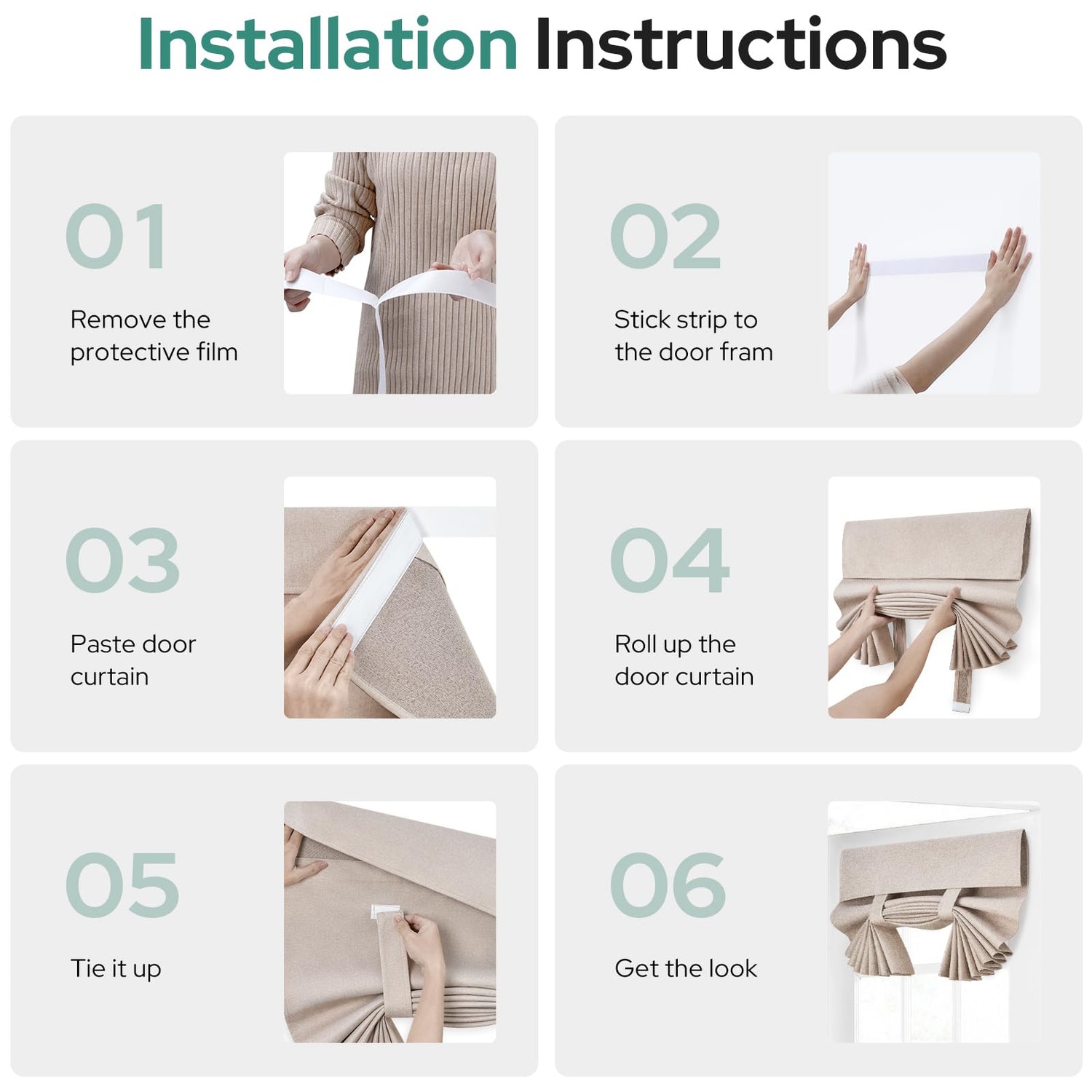 - 🌸EASY HANGING: The package includes 1 door curtain panel and 1 adhesive strip. It can be easily installed without any tools or curtain rods. Just follow our instructions picture to install, put the sticky strip on the glass, and join together with the sticking place on the door curtain panels firmly.