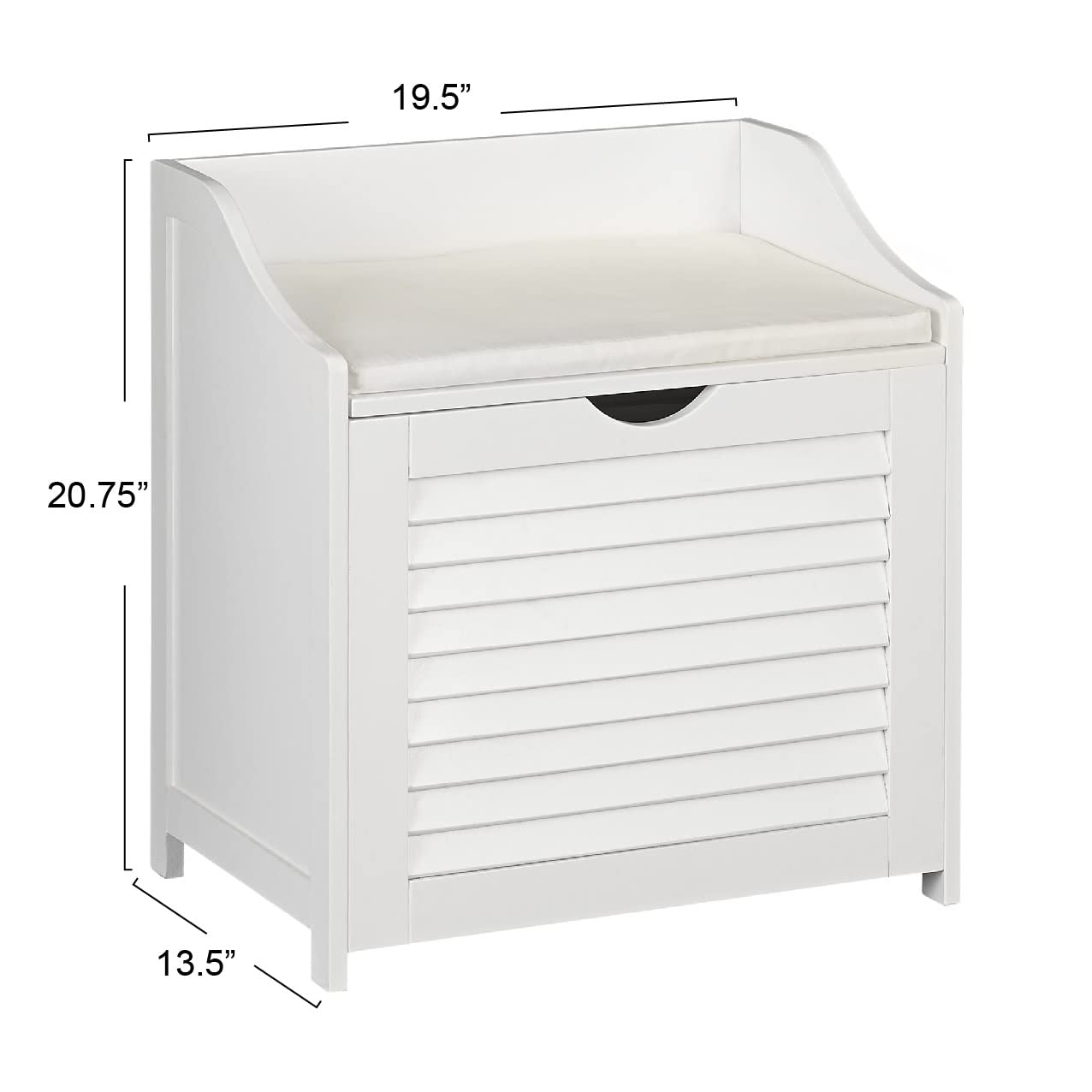 Details: Household essentials hamper cabinet seat does double duty as a hamper and a low storage seat in this space-saving unit. This single-load hamper has a simple lift-lid and comes with a removable, washable liner. The liner hangs in the cabinet on removable wooden handles. These handles rest comfortably on the cabinet's interior frame. This inside-out design creates a seamless look to the piece, and makes it very easy to use! and a cushion for the seat makes resting just that much better. Its attractive shutter front makes it a beautiful accent piece for your home--in the bedroom, in the hallway, in the mudroom, or in the bath! and that seat is perfect for bath time and helping your family put on shoes. This hamper seat measures 13.375 Inches high, 20.875 Inches wide, and 19.18 Inches deep.