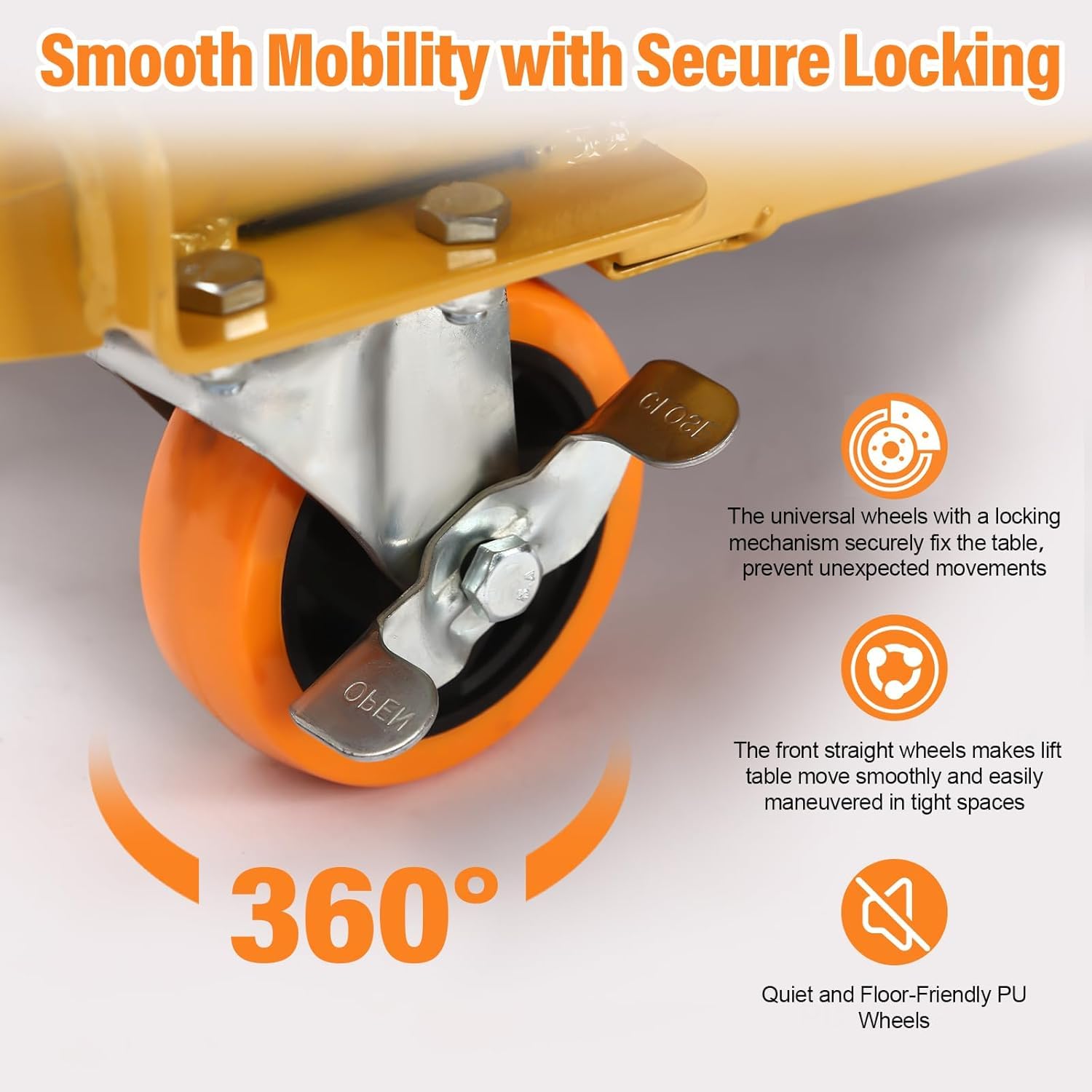 - 【Easy Mobility】: This hydraulic lift table equipped with 2 front straight wheels and 2 rear universal wheels, this product can move smoothly while making it convenient for you to operate it flexibly in narrow spaces and passageways. The locking mechanism of the universal wheels securely fixes the product in place, preventing unexpected movements during transportation. The PU wheels are not only wear-resistant and do not harm the floor, but also just make a small noise that will not disturb others.