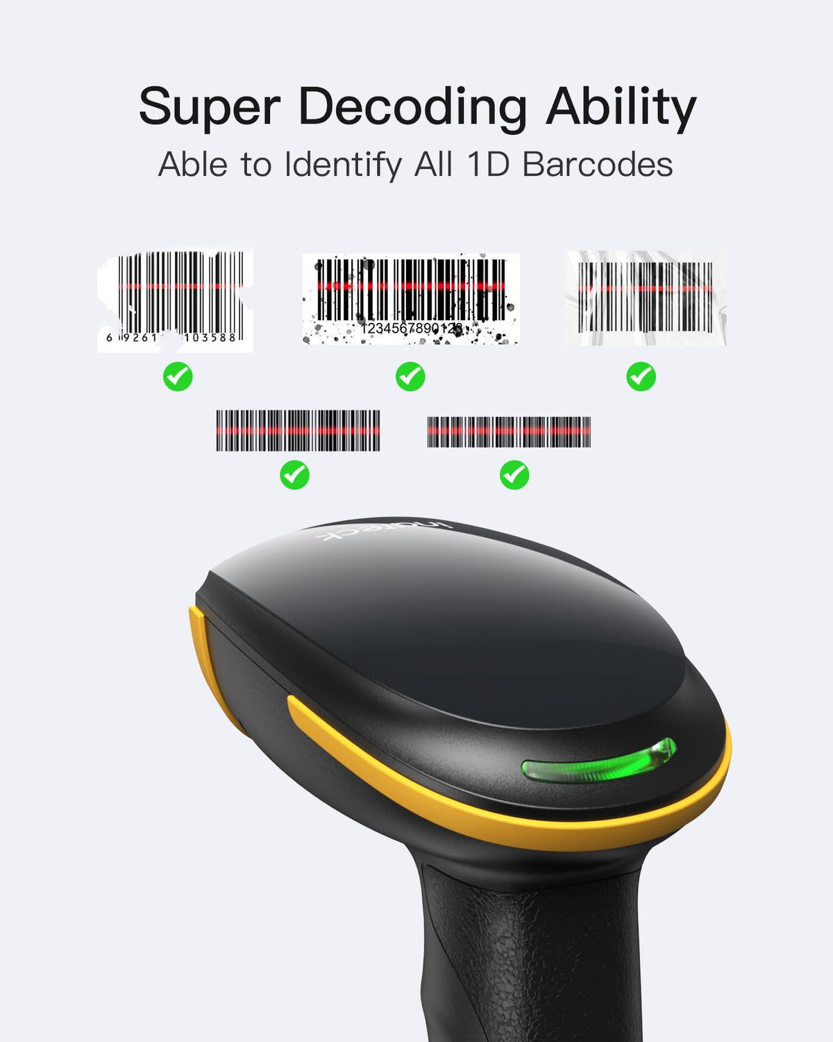 - Super Decoding Capability: Utilizing a laser module for recognition, it supports reading all common 1D barcodes. It quickly reads blurry, damaged, dirty, wrinkled, and distorted barcodes under strong and dim lighting conditions