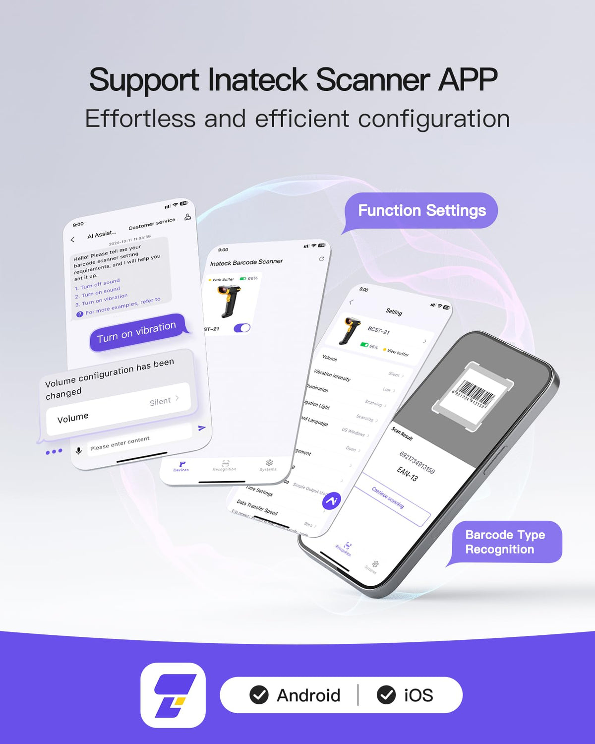 - Support Inateck APP: In the app, easily configure your handheld scanner, eliminating the frustration of losing the manual. Common functions such as barcode type recognition, Bluetooth connection and management, battery level display, alert preferences, and barcode type settings can all be effortlessly configured in the app. Stay tuned for continuous updates with more applications and features