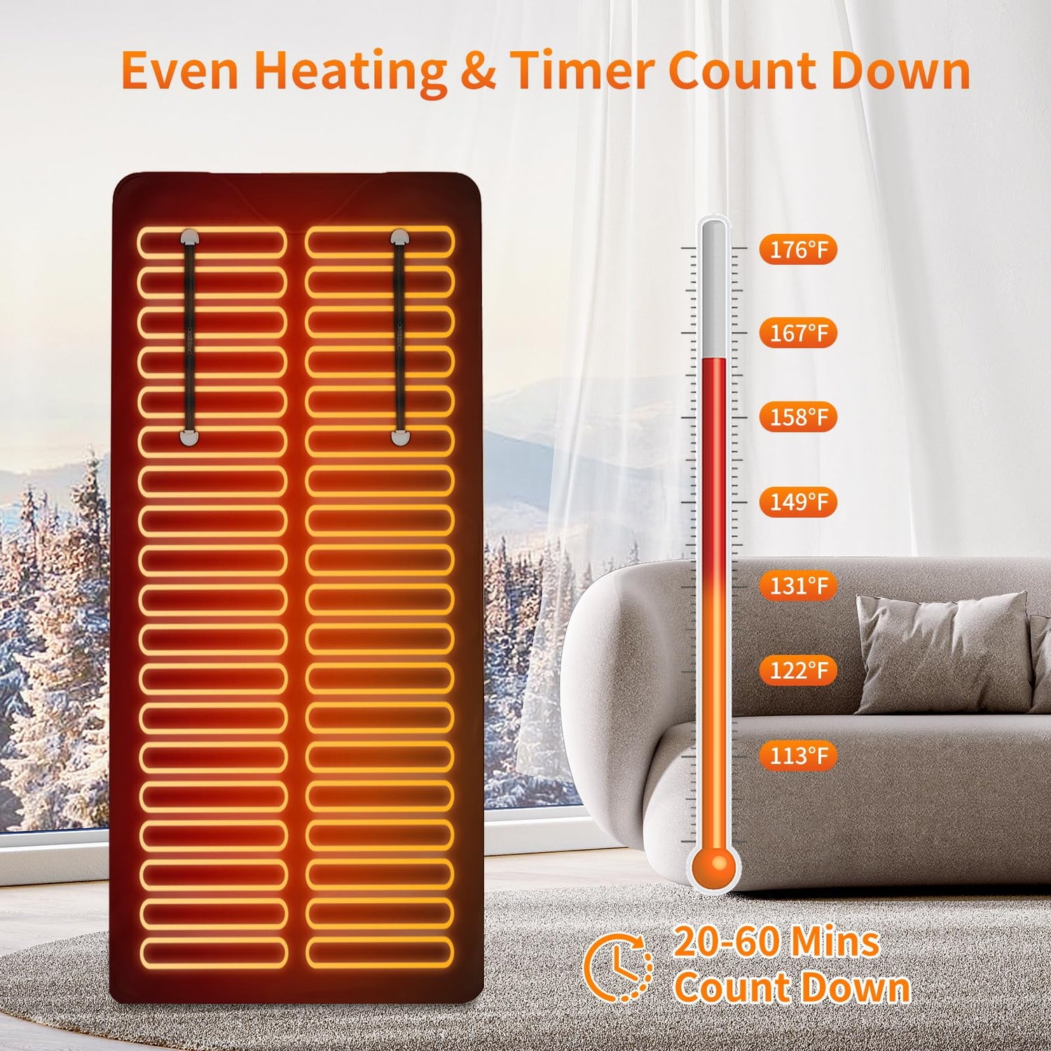 - 【8-Level Temperature Adjustable】 Hervimo sauna blanket can adjust the temperature easily with 8 settings (113-176℉/45-80℃). The upgraded heating wire is denser, and provides even heating. The built-in temperature sensor accurately monitors the temperature to prevent overheating.