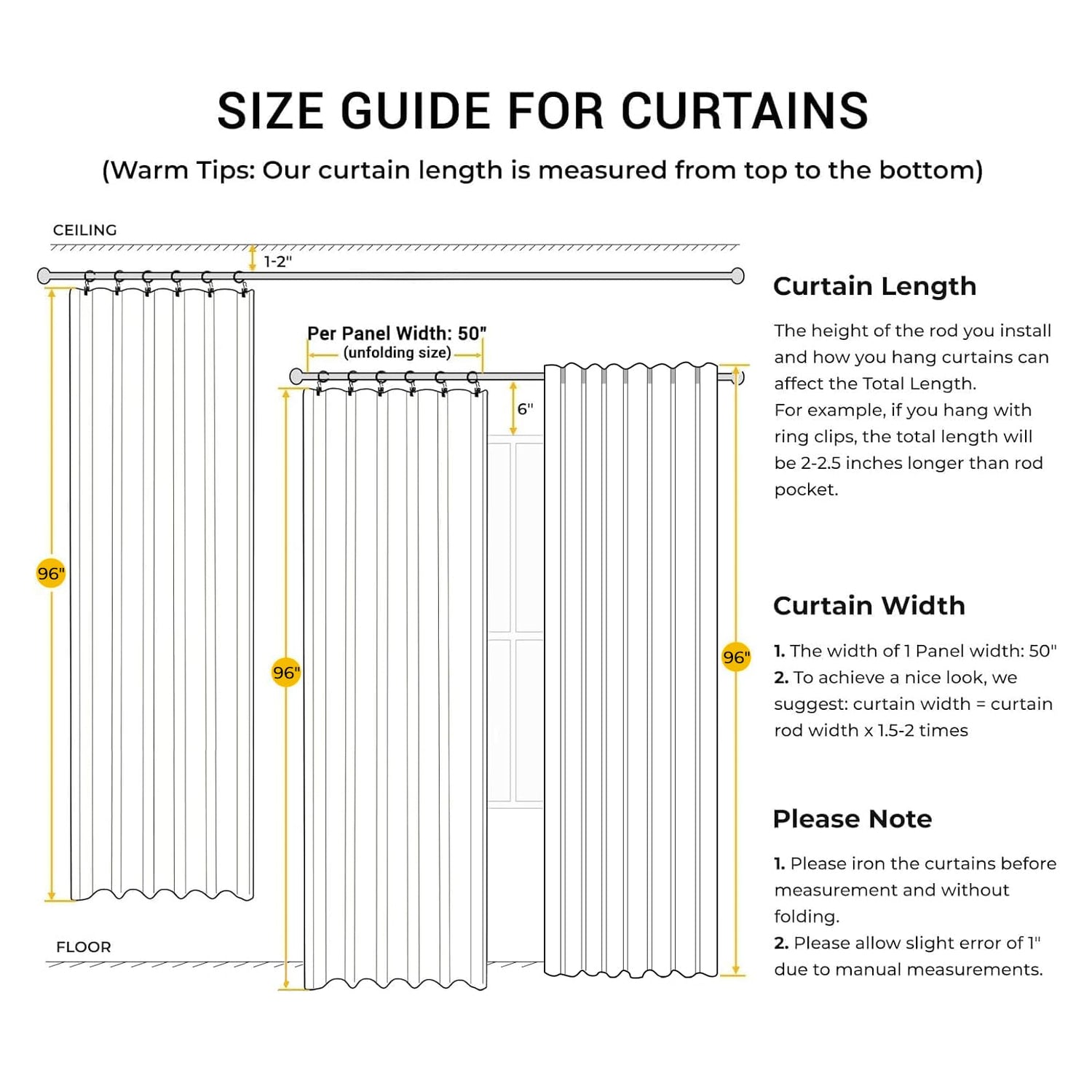 - Blackout Curtain Panel Dimensions: Our beige blackout curtain set includes two individual panels each measuring 50 inches wide and 96 inches long. Curtain ring clips measure 1.2 inches in diameter.
