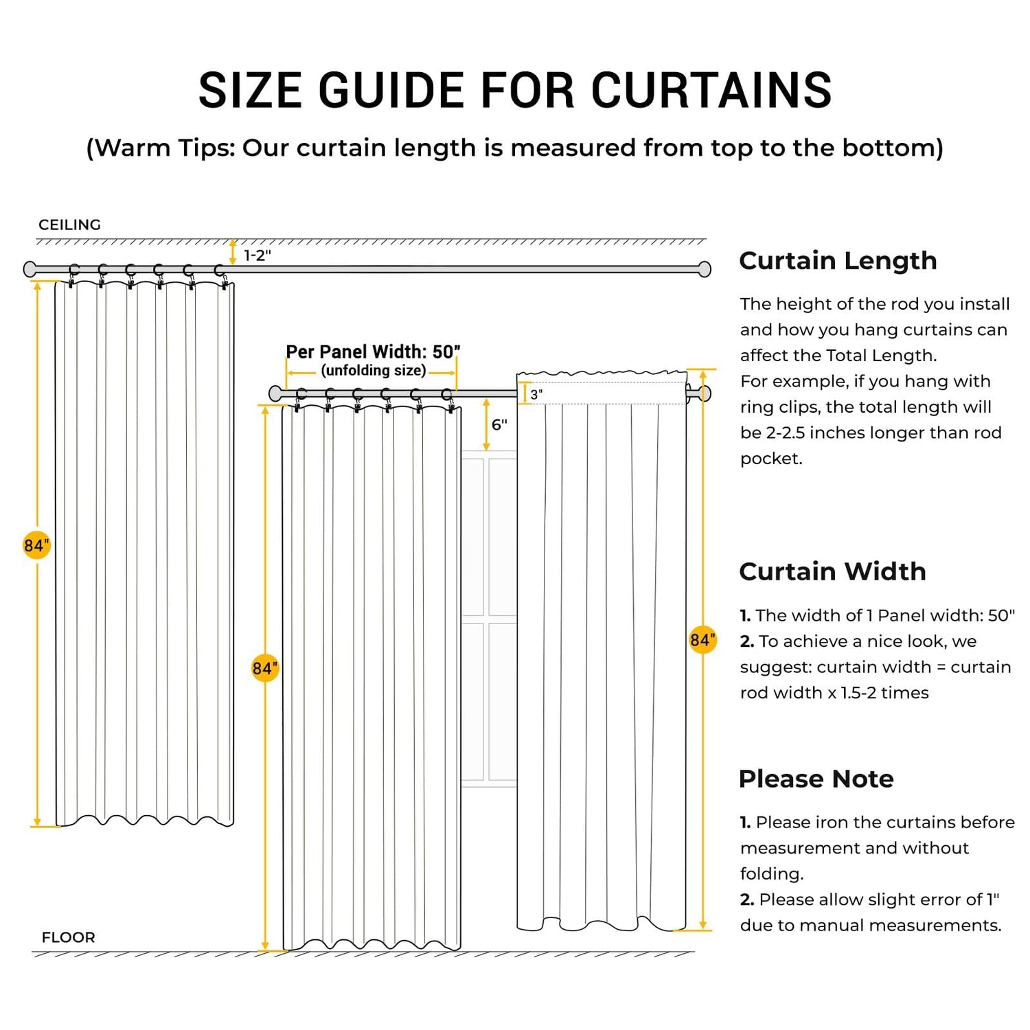 - Blackout Curtain Panel Dimensions: Our beige curtain set includes two individual panels each measuring 50 inches wide and 108 inches long. Curtain ring clips measure 1.2 inches in diameter.