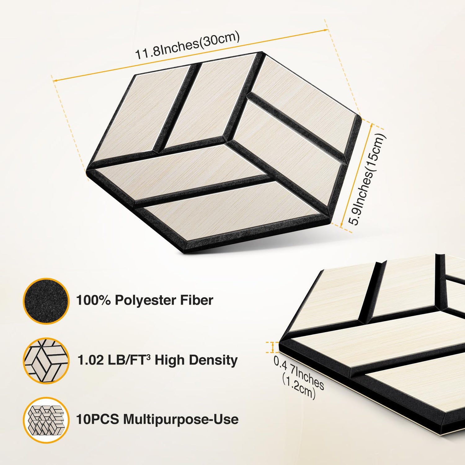 JAMELO Self-Adhesive Acoustic Panels, 10 Pack Wood Grain Sound Proof Acoustic Foam, High Density Hexagon Wood Slat Panels, 3D Sound Absorbing Wall Panels for Home Studio Office Decor Noise Reduction