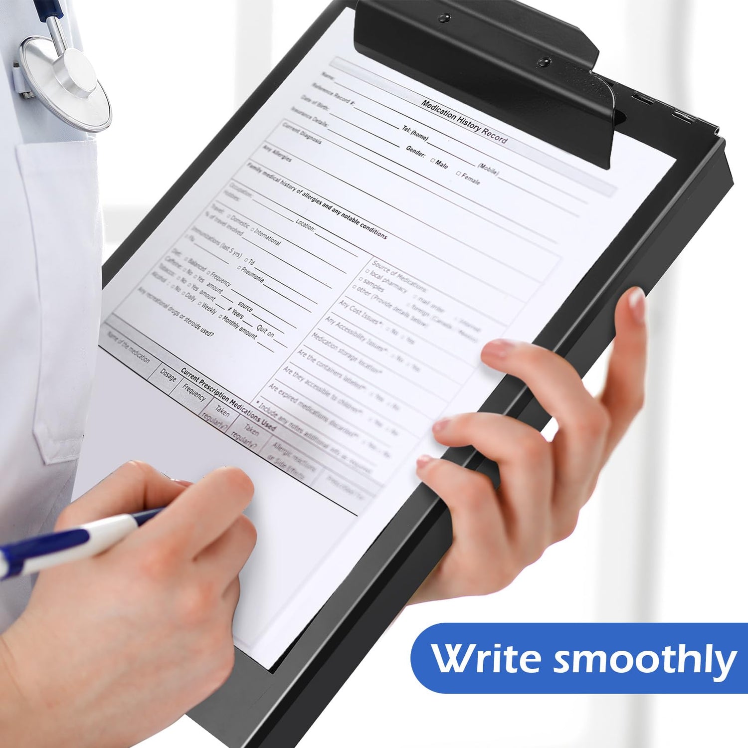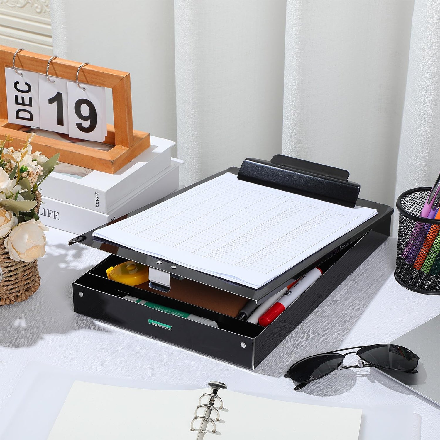 - Robust Storage Ability: experience the power of efficient organization with metal clipboard with storage; Crafted from sturdy black colored aluminum, these clipboards are designed to securely hold up to 150 sheets of 20lb paper, fitting documents up to 8.5 x 11 inches when laid flat on a table; Thanks to an intelligent open top and dual tray design, you can conveniently hold 100 sheets on the outer surface, suitable for busy days