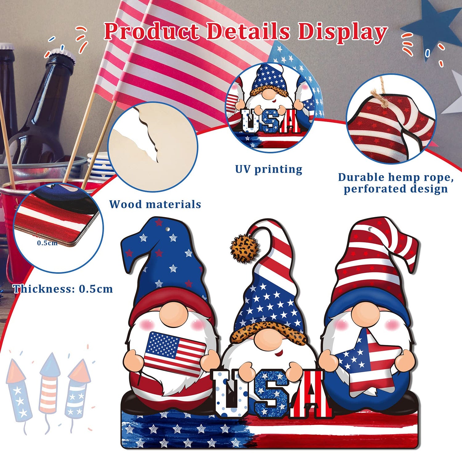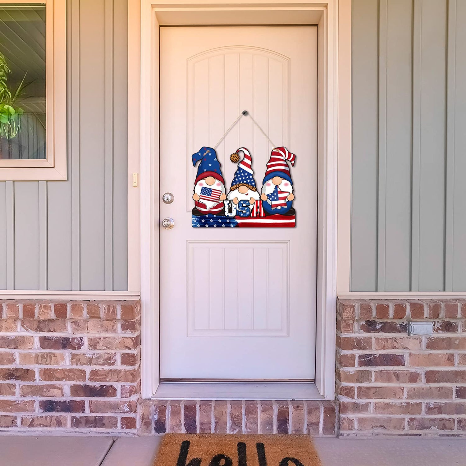 Jetec 4th of July Independence Day Decorations American Patriotic Rustic Wooden Plaque with Rope, Wood American Flag for Front Door Porch Wall Window(Gnome Style)