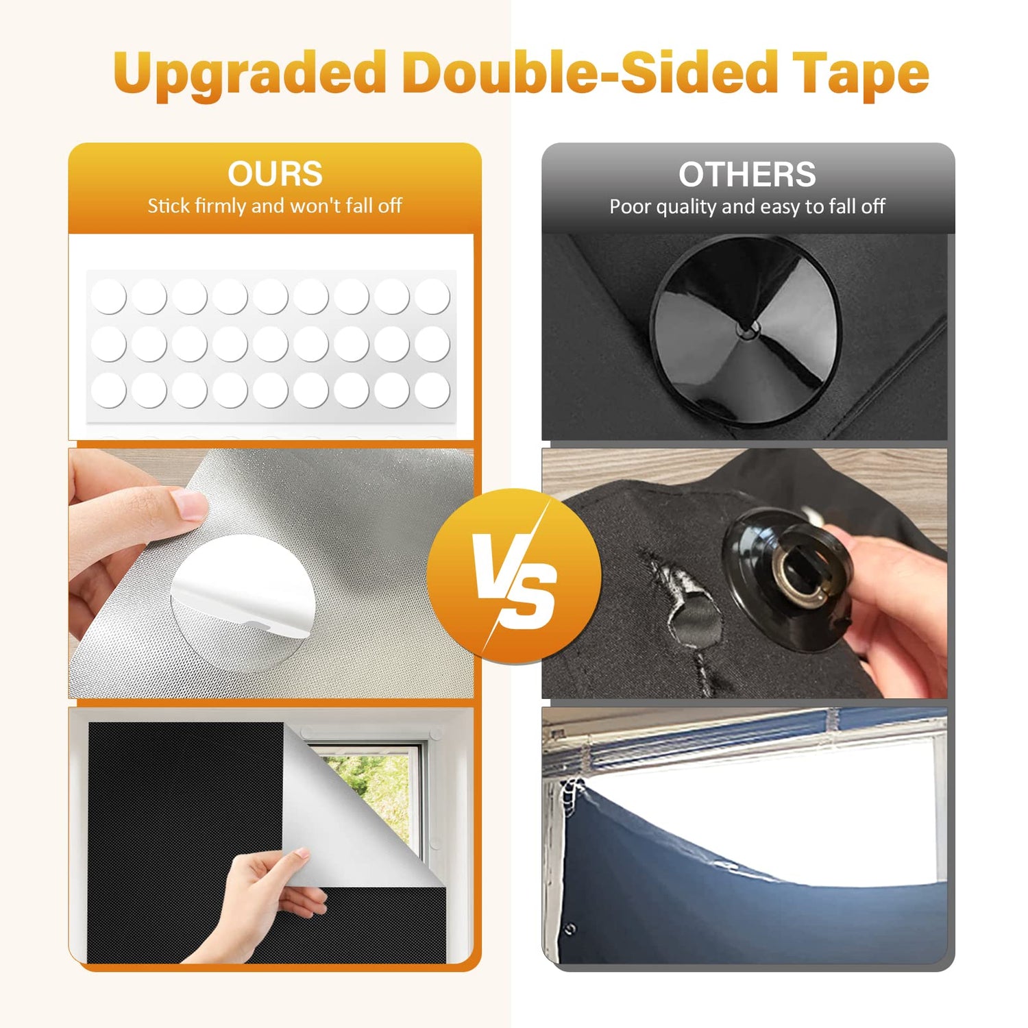 • Upgraded Adhesive Tape: 26 pieces of upgraded adhesive tape come with a strong adhesive force to ensure that portable blackout curtains stick firmly to the windows for a long time. It also leaves no residue when removed and can be reused. Tips: Make sure the window is clean and dry before use.