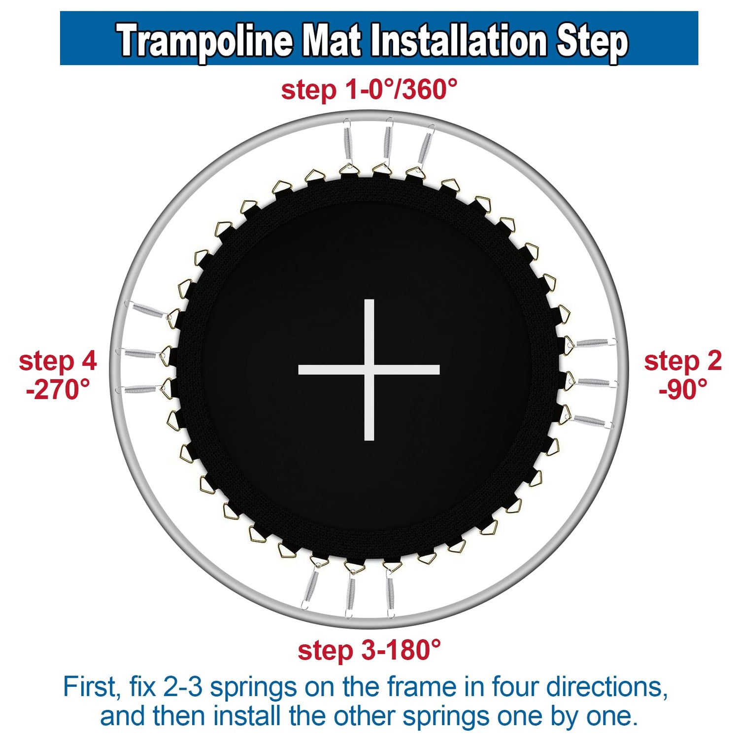 • π‘΄π’†π’‚π’”π’–π’“π’†π’Žπ’†π’π’• π’”π’•π’†π’‘π’”οΌšPlease measure your trampoline mat size correctly before purchasing. The first being your trampoline’s frame diameter, then your spring (or v-ring) count, and finally the length of your springs measured from hook end to hook end.