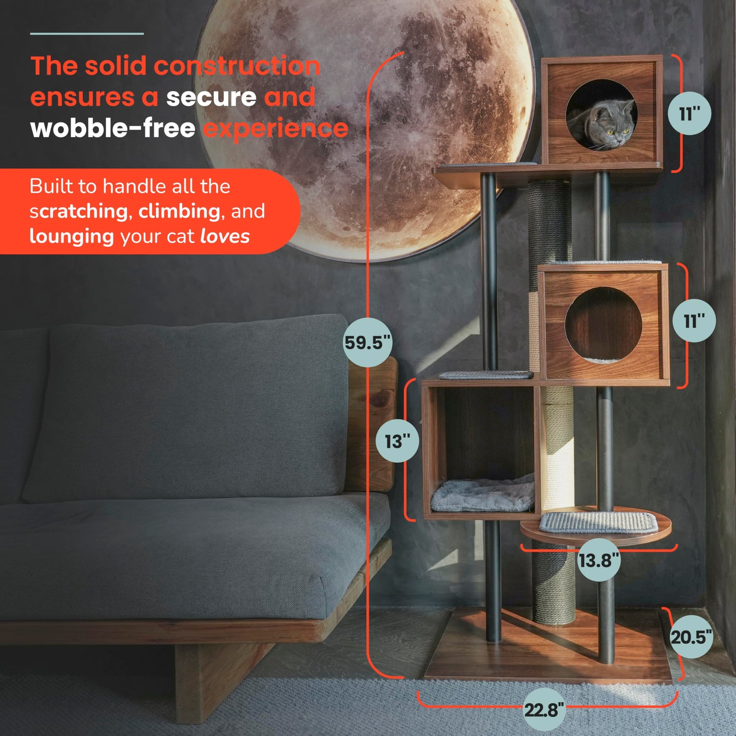 KONELCARE Modern Cat Tree-Sleek Wooden Furniture-Style Tower(60") Blends with Home Decor, Tallest Scratching Post(48"), 3 Cat Condos for Multi-Cat Harmony & Comfort