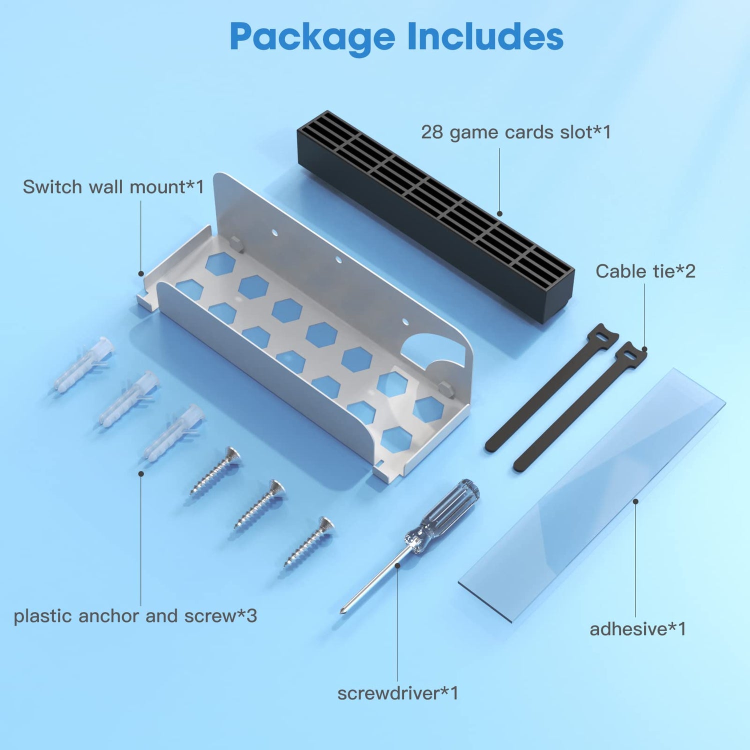 - PACKAGE INCLUDES: 1 x switch wall mount, 1x 28 Game Card Slots, 1 x screwdrivers, 3 x Screws, 3 x Expansion Screws, 1 x double-sided tape, 1 x installation manual