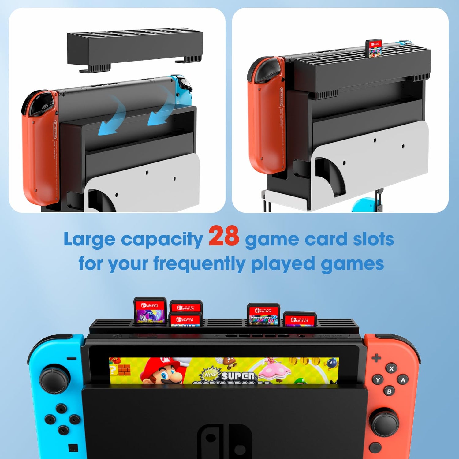 - 28 GAME CARD SOLTS & 2 JOY-CON HOOKS: This switch wall mount kit comes with a slot for 28 game cards and two extra hooks for the Joy-Con. Store your game cards and Joy-con so you can quickly find them next time