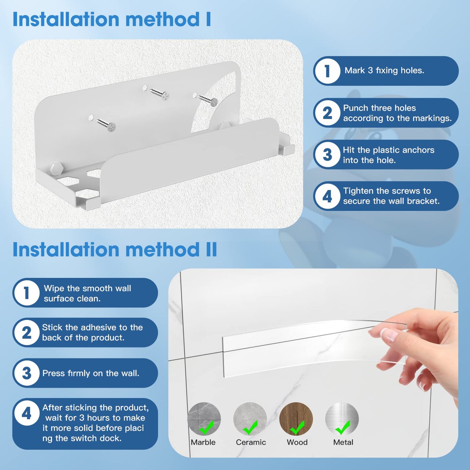 - TWO TYPES OF INSTALLATION: This switch wall mount has customized double-sided tape and screws in two options to suit your needs. Double-sided adhesive installation is suitable for smooth walls, wait 24 hours after installation before use