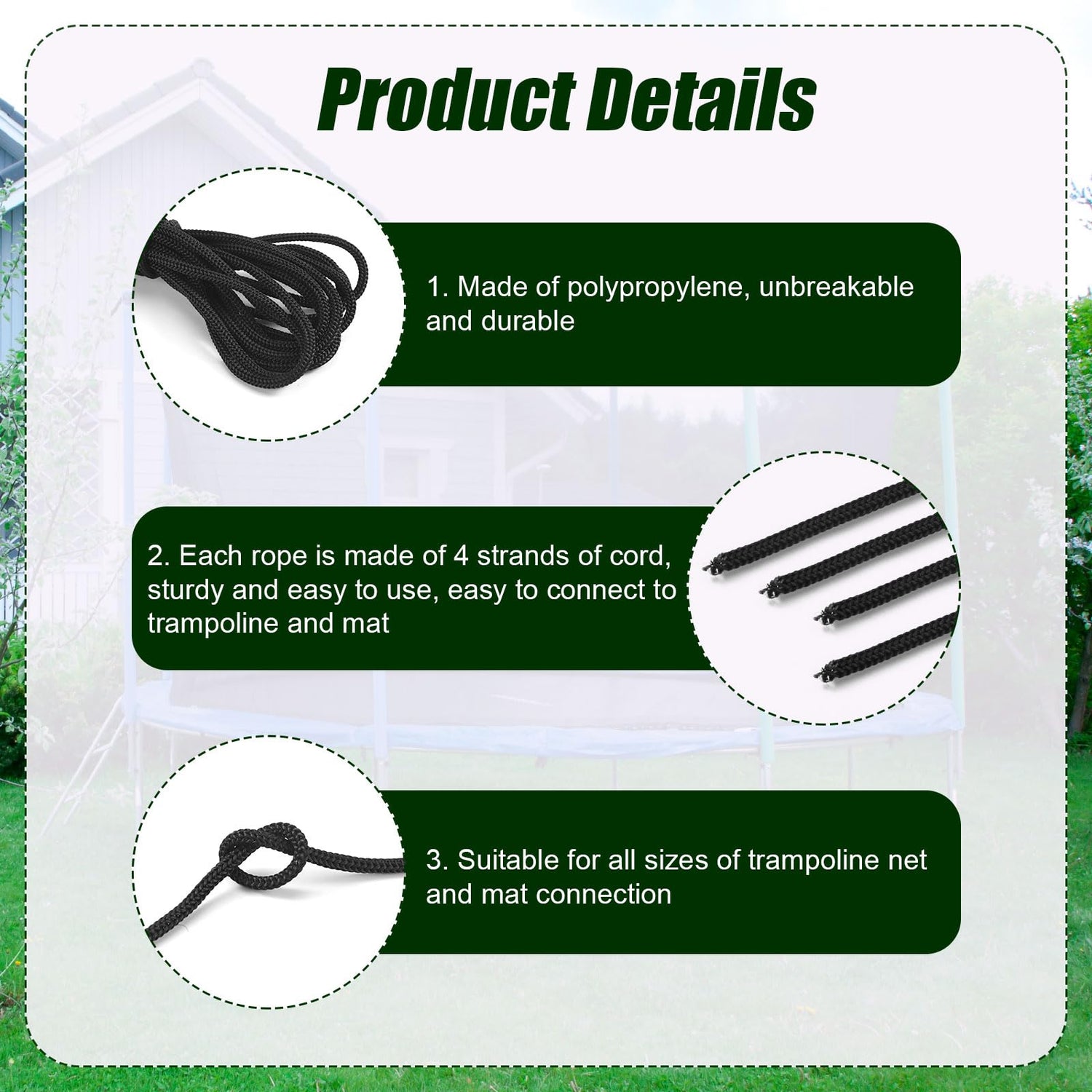 - Durable Material: The trampoline rope is made of quality nylon material, which ensures reliable, strong and durable properties and is not easy to break or fade. Let you feel more relax when playing.