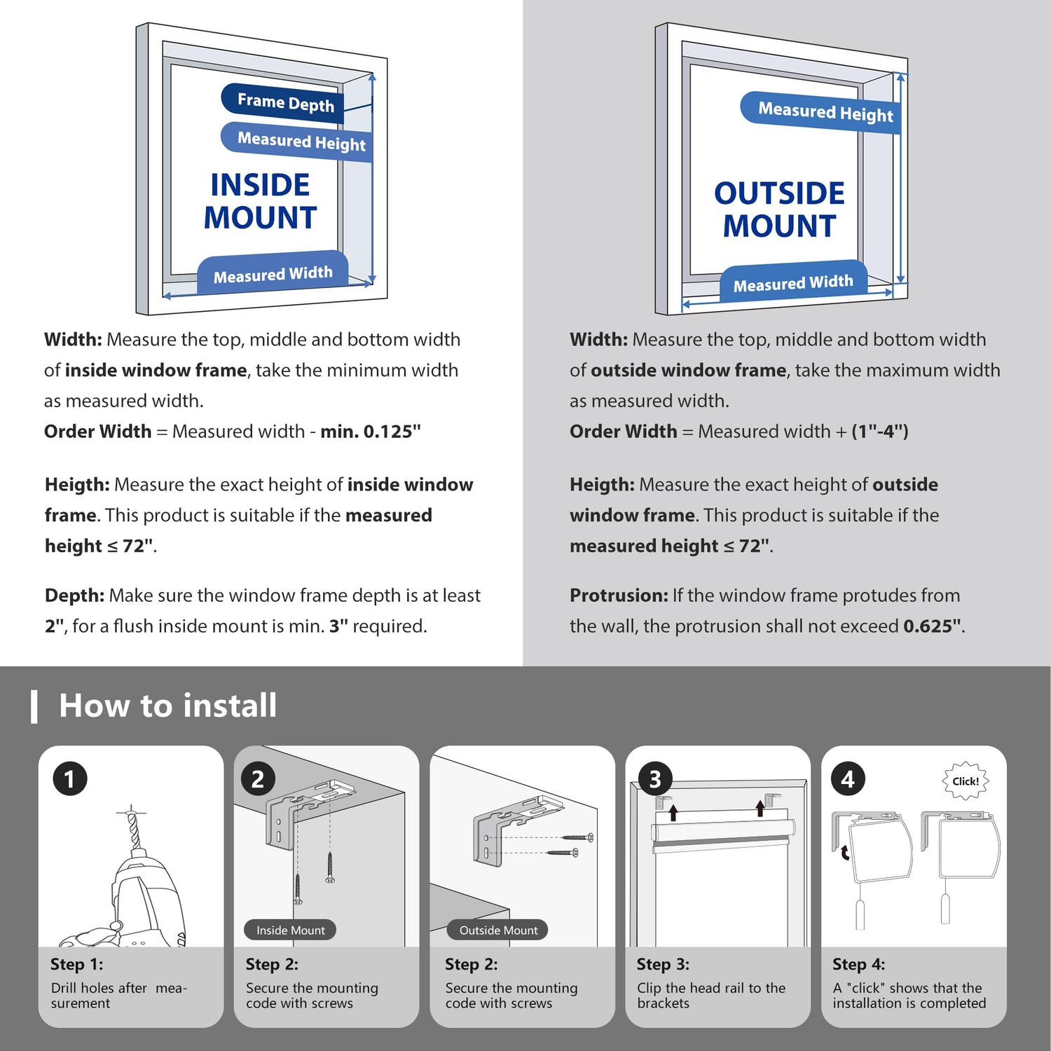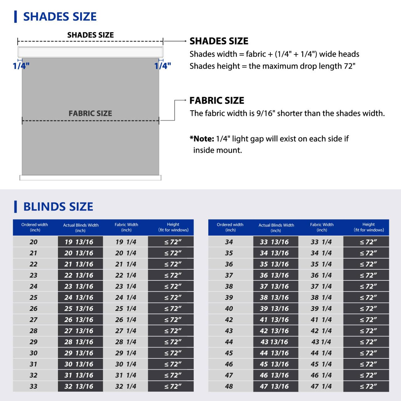 - How to Choose a Proper Size: For INSIDE mount: choose the size SAME or CLOSEST to your window width. For Example, if your windows are 30" wide, order 30" or slightly less for internal installation. For OUTSIDE mount: For outside mount, we recommend order (2-4)inch wider than your window width for better coverage. For Example, if your windows width is 30", order size 34" would be okay for outside mount. (Pls Note) Fabric width will be 9/16" narrower than the size of the shade.