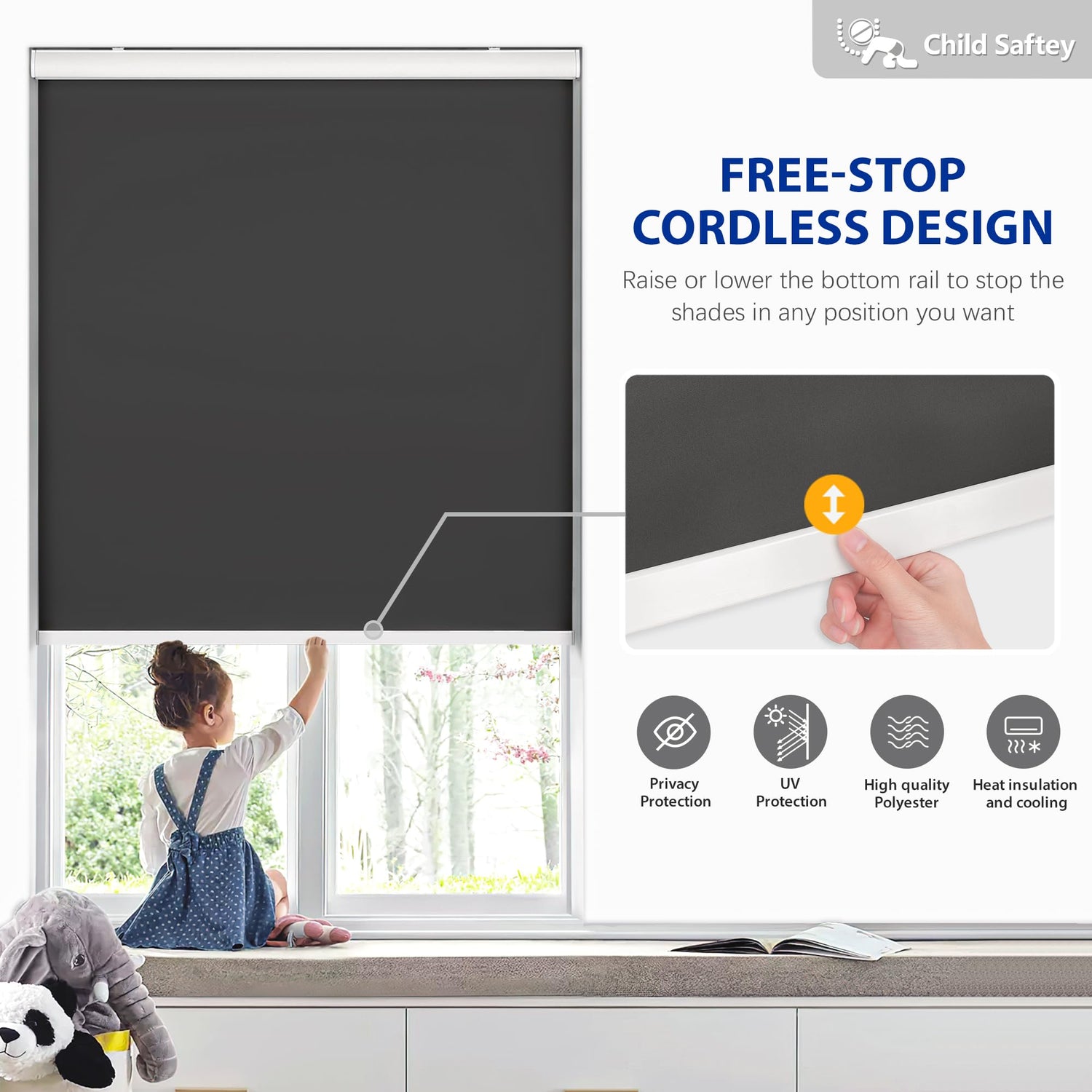 LazBlinds Cordless Roller Shades, Free-Stop Blackout Roller Blinds with Cassette Valance, Thermal Insulated UV Protection Waterproof, Roll Up Blinds for Windows, 30'' W x 72'' H, Black