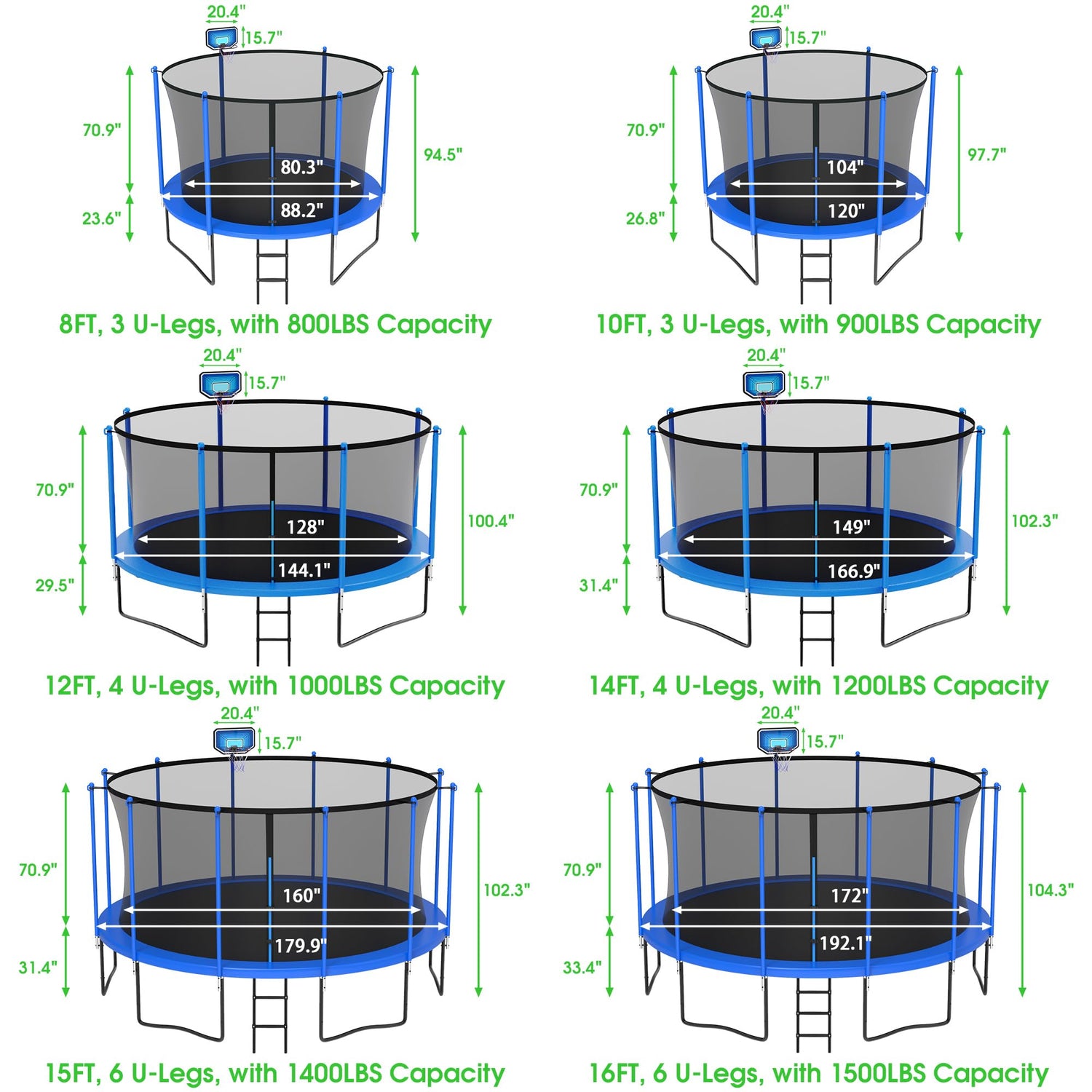 - 👍【1500LBS Load Capacity Trampoline】LHX 14 ft trampoline with basketball hoop set includes 1* trampoline light, 1* trampoline sprinkler, 4* galvanized stake anchors, 1* ball and a Inflator. LHX 1500lbs capacity trampoline can hold 5-9 kids or 2-4 adults. Outdoor heavy duty 14 ft trampoline's standard polypropylene bounce surface provides unmatched rebounding force and can hold up to 1500lbs. [IMPORTANT] Light and Sprinkler are shipped Separately and may be put in your MAILBOX!