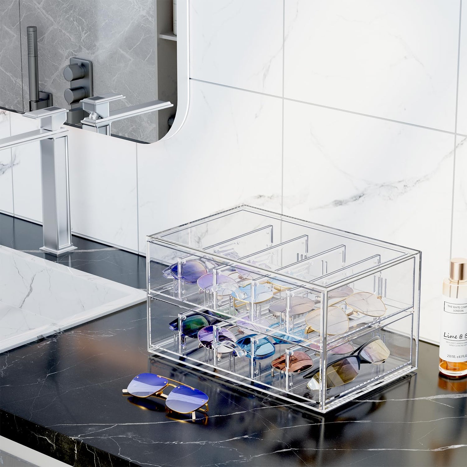 Lolalet Clear Sunglasses Organizer with Drawer, Eyeglass Eye Wear Display Case Storage Box with Removable Dividers for Multiple Pairs -1 Pack