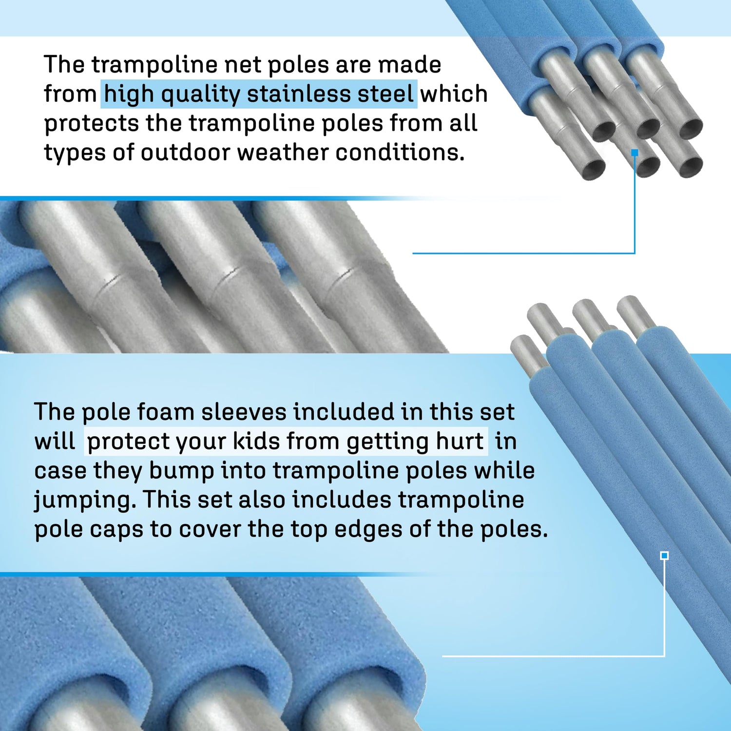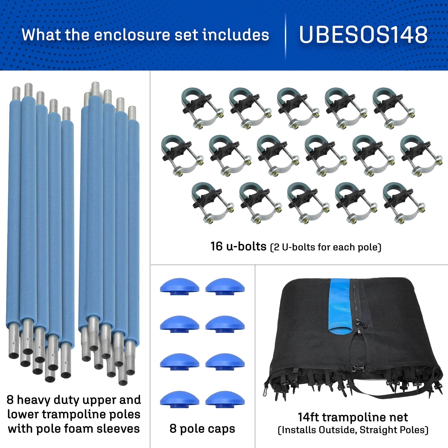 Details: Trampoline safety fail?? Trampoline enclosure set is a must to have to ensure the maximum safety for your kids and their friends! Fits for a 14 ft. Trampoline frame with 4 or 8 W-shaped legs, actual net height: 71". Compatible with trampoline legs of up to 1.5" Diameter. Upper Bounce "sleeves on poles" Net, connects to trampoline by covering the poles with sleeves which gives you more area space to jump and enjoy! Get this Upper Bounce high quality trampoline safety enclosure set so you can relax inside your home while your kids are jumping outside! An essential safety feature for any backyard trampoline. Don't jump without one!