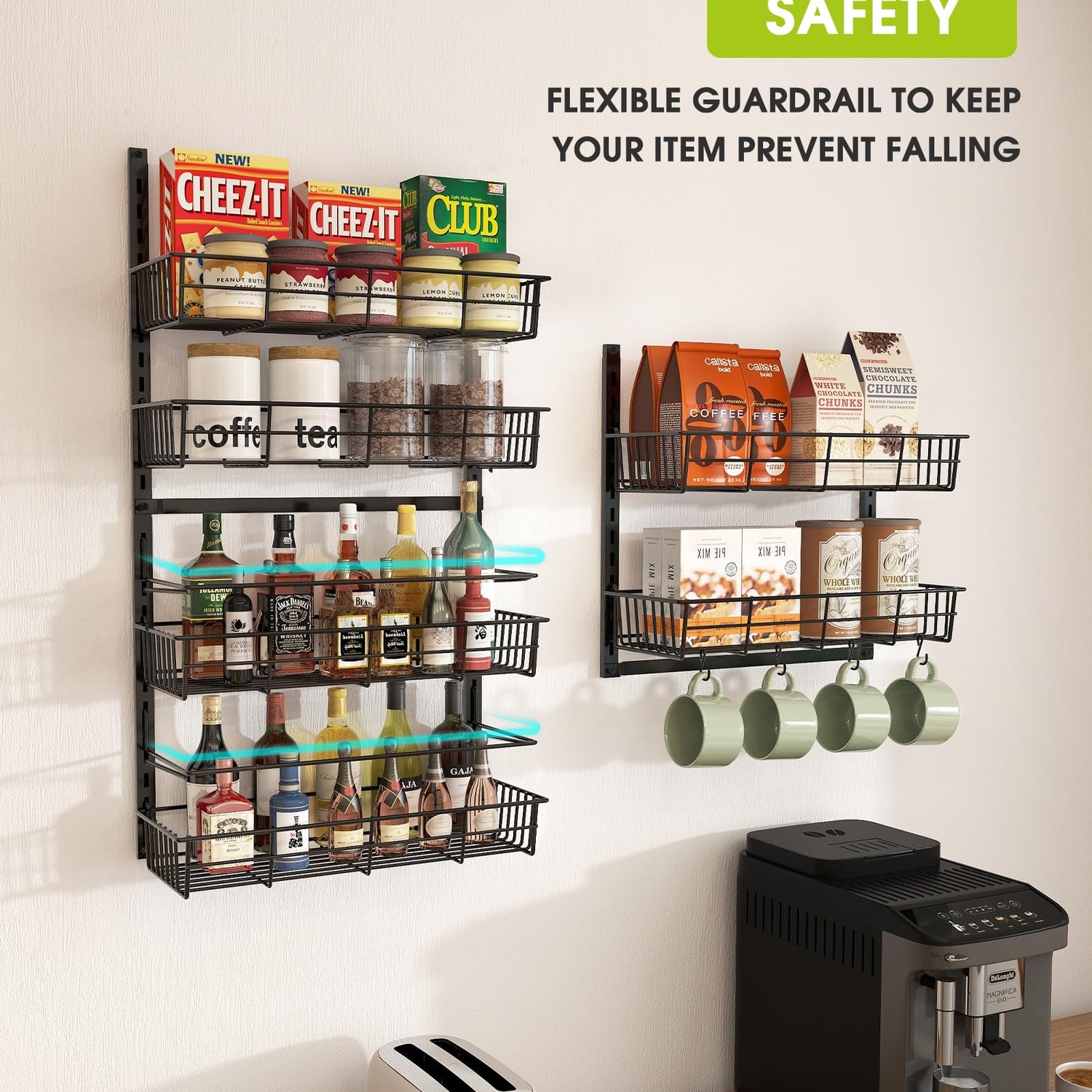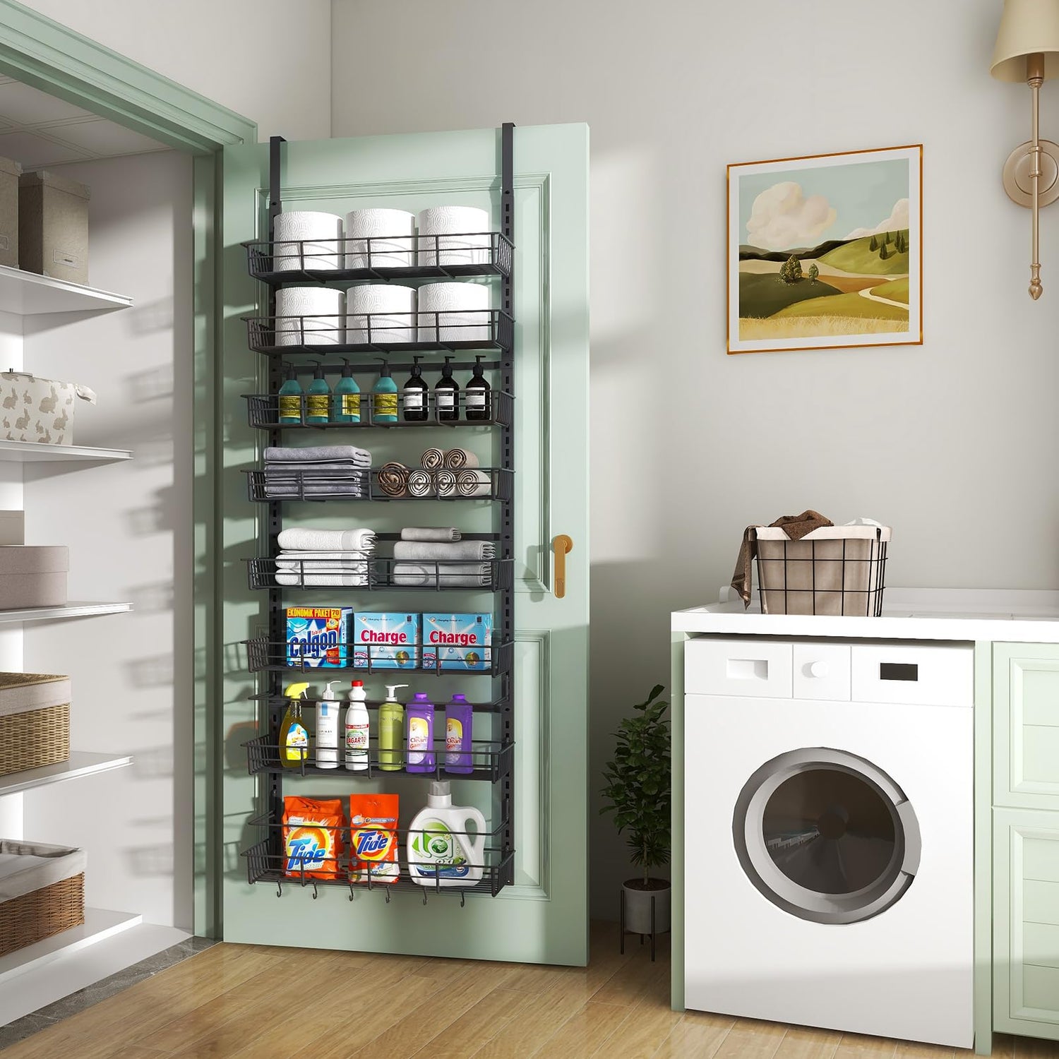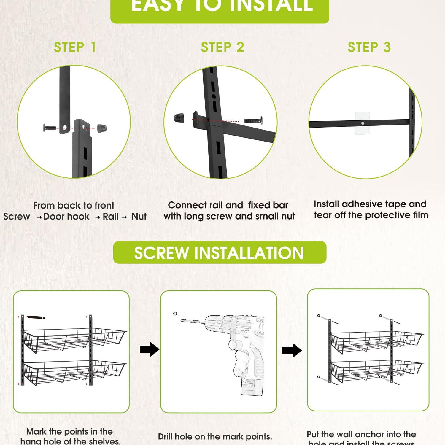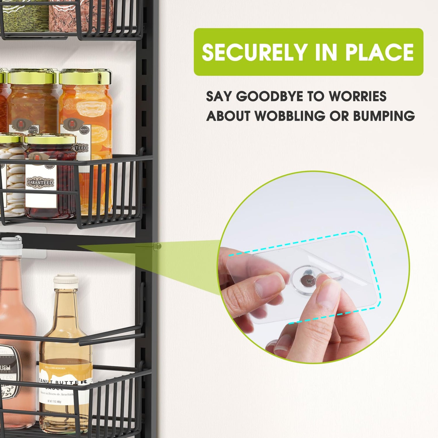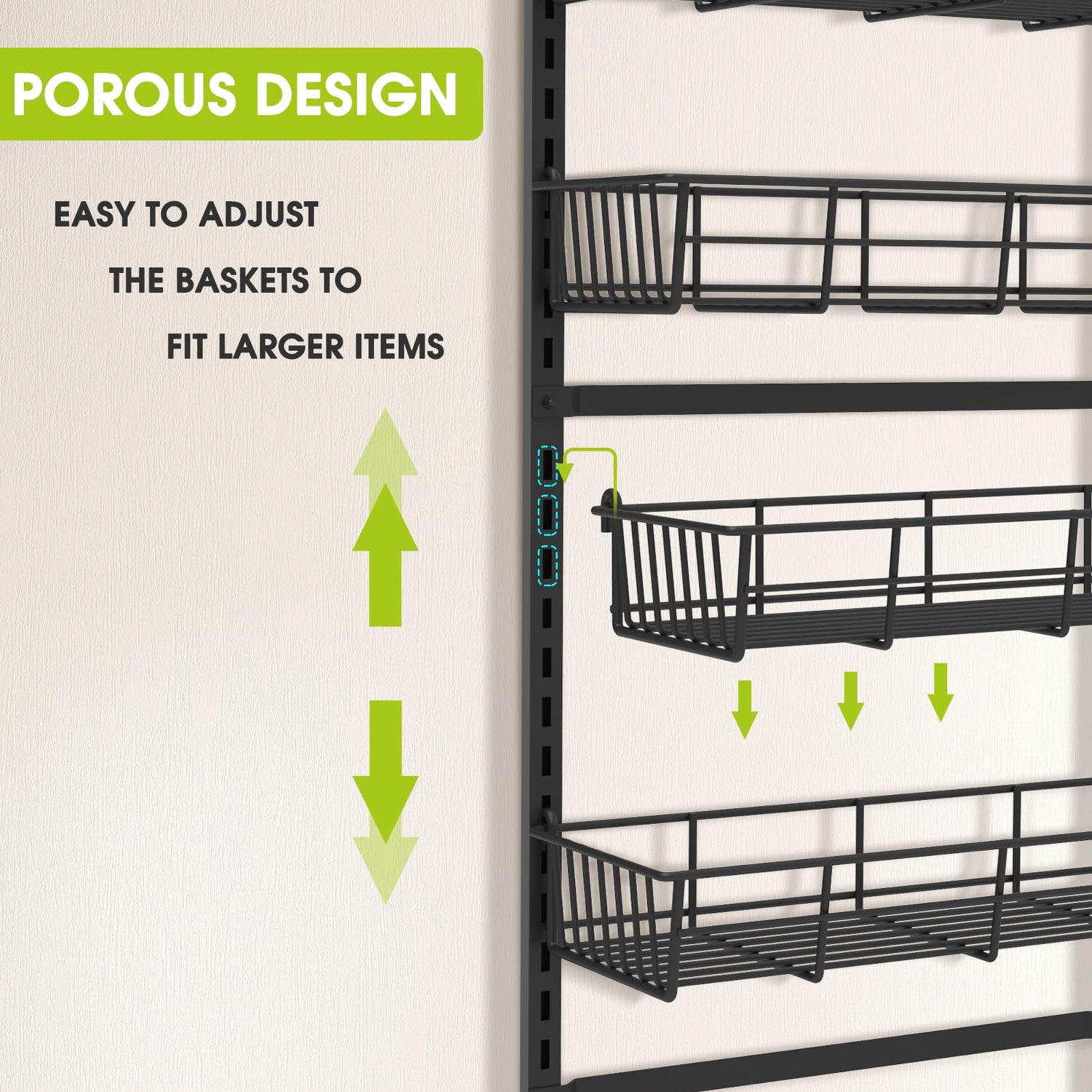 • Adjustable & Wall-Mounted: This over the door pantry organizer can be adjusted to accommodate items of different heights. You can easily nail this rack to your wall or door for a secure and sturdy fit. The rack also features 6 flexible hooks and 4 adhesive stickers, which help to prevent swinging when opening and closing doors. The full basket design also ensures that your items won't slide off the back of the rack.