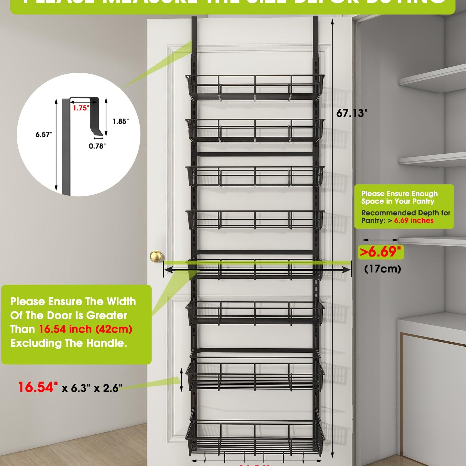 • Multifunctional Use: Measuring 6.69"D x 16.5"W x 67.13"H, with basket size of 5.9"D x 16.1"W x 2.6"H, this storage rack is the perfect size for any room in your home. Whether you need extra storage space in your kitchen, bathroom, pantry, cabinet bedroom or closet, this Door Hanging Organizer has got you covered!
