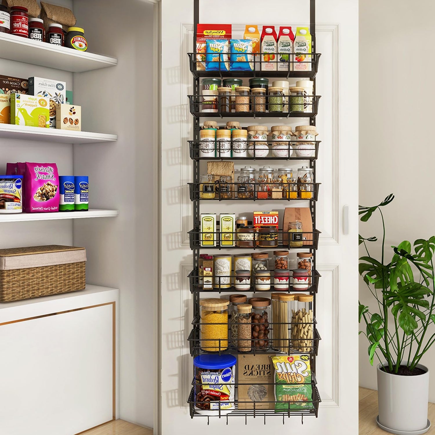 Mefirt Over The Door Pantry Organizer, Wall Mount Spice Rack, Pantry Hanging Storage and Organization, 8 Adjustable Baskets Heavy-Duty Metal for Home & Kitchen, Back of Door Seasoning Rack - Black