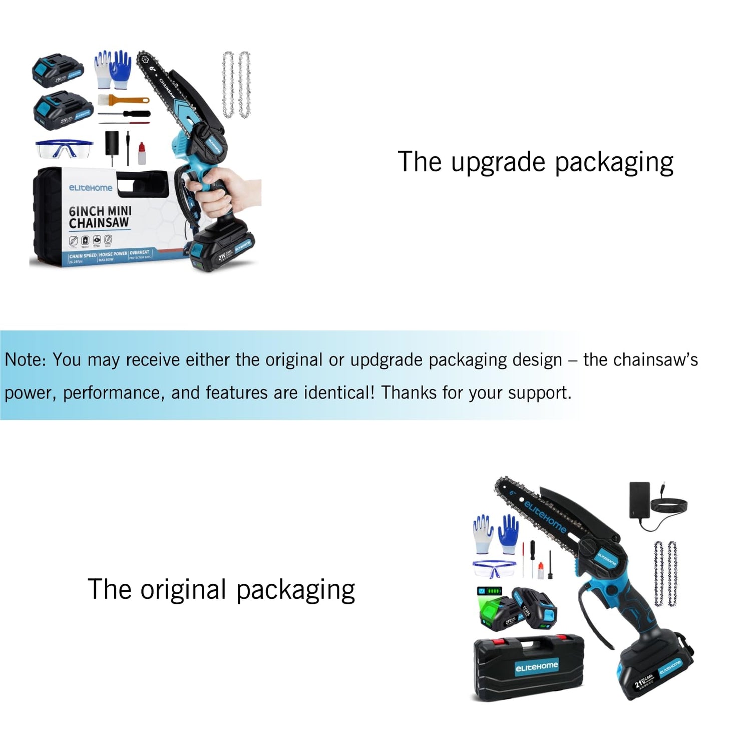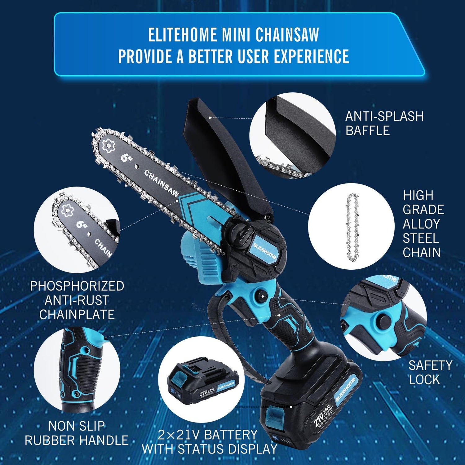- 【POWERFUL MINI CHAINSAW】: Meet EliteHome's Cordless Mini Chainsaw, compact & strong for wood cutting, trimming, etc. With a 6-inch chain and pure cooper motor, it cuts branches easily, ideal for courtyard, home, & garden tasks. Cordless for unrestricted freedom.