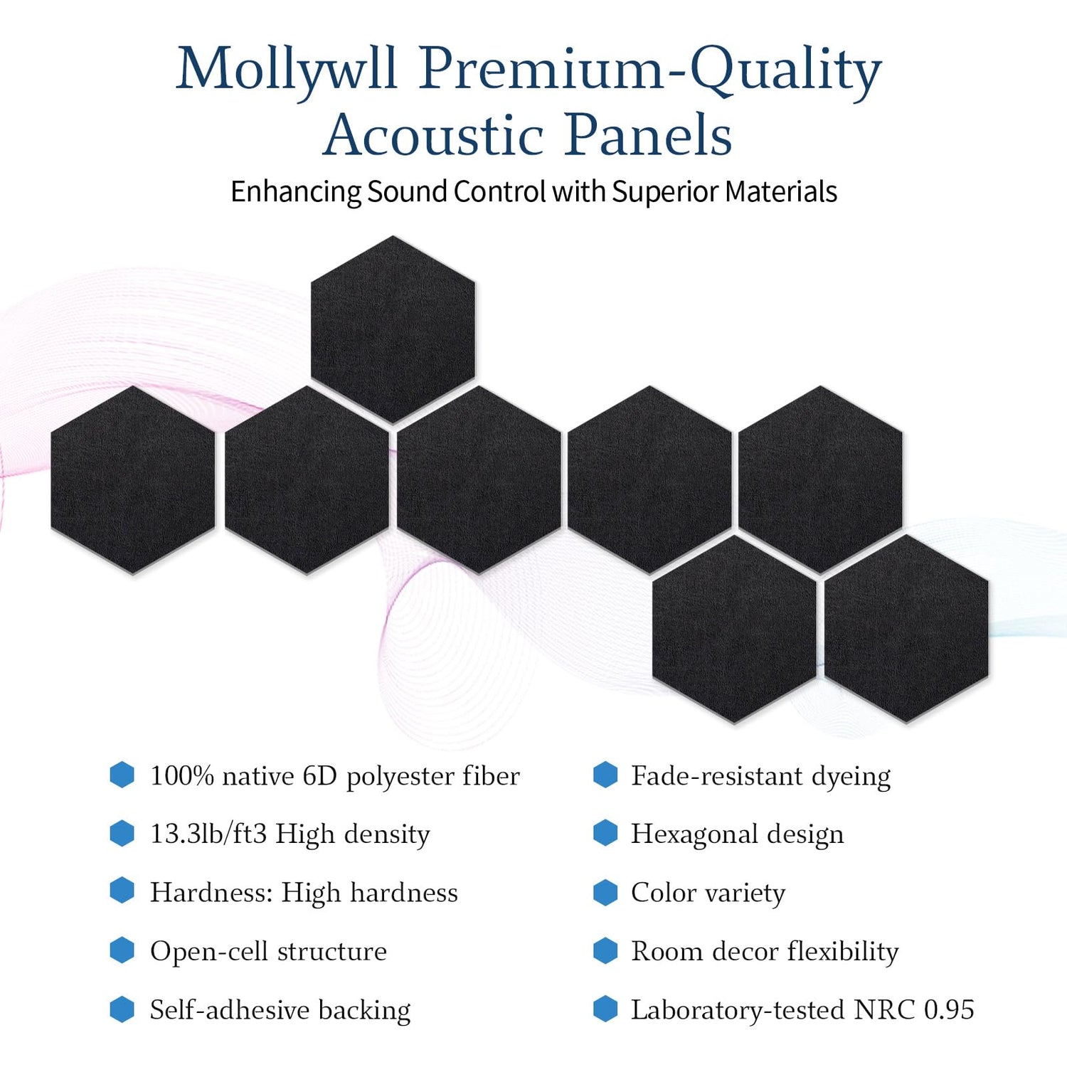 Mollywell Hexagon Acoustic Panels, High Density, Soundproofing, Decorative Noise Reduction Felt Wall Tiles for Ceilings, Home Office & Gaming Room (Black), 12x10x0.4 Inch