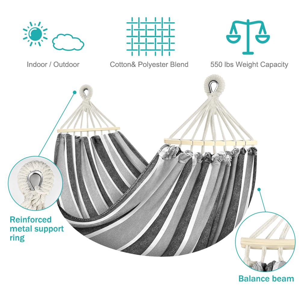 MOSFiATA Hammocks Portable Camping Hammock Upgraded 550lb Comfortable Fabric Hammock with Two Anti Roll Balance Beam and Sturdy Tree Straps for Camping, Patio, Backyard, Outdoor (Gray White)