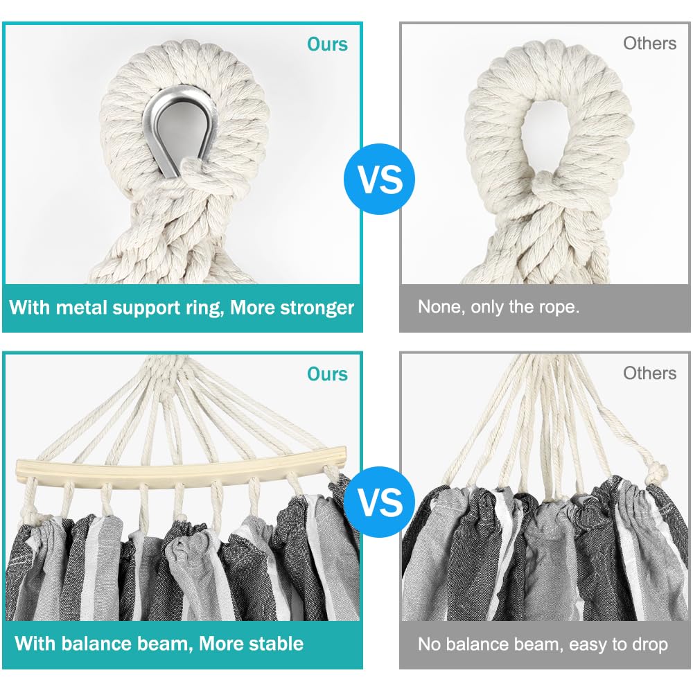 - 【Sturdy Metal Knot】The metal knot can prevent the long term friction between the knot and the tie rope. This prolongs the life of the tree hammock (extends the time limit by 50%). Additionally, the hammock comes with straps, ensuring a secure and stable attachment to trees.
