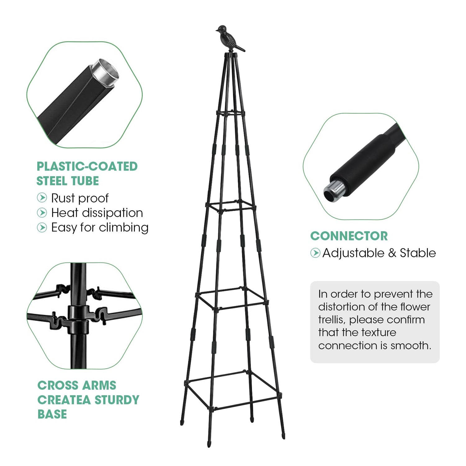 • 【Waterproof and Durable】: Our obelisk trellis is made of metal tubes and PE plastic coating, which prevents the tower from rusting, waterproof and able to withstand all kinds of weather conditions, ensuring a long service life.