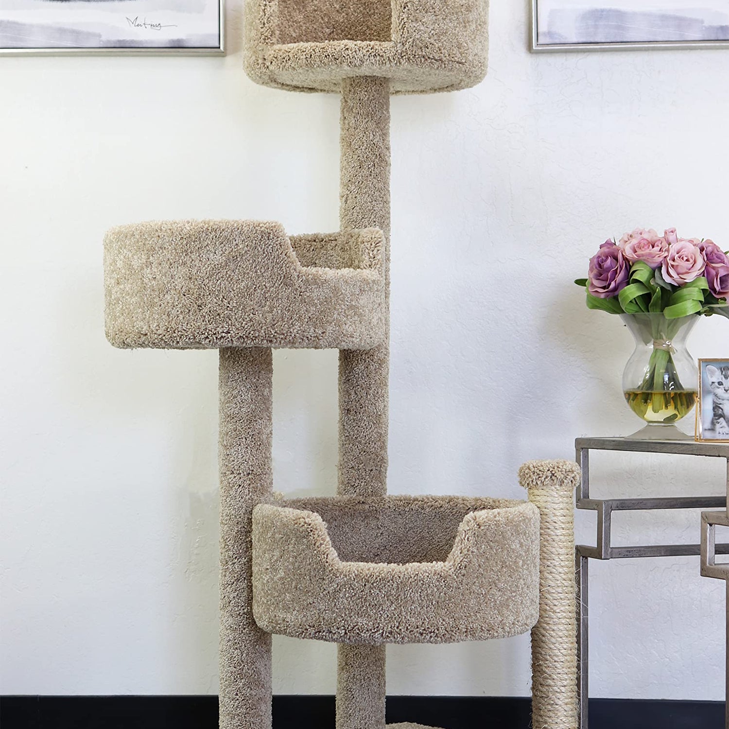 Details: New Cat Condos Deluxe Cat Tree is built with solid wood construction to keep it steady and keep your furry friends feeling safe and secure. This design features an easy assembly process and ample spacing from the bottom perch to the middle perch to help kitty climb each level. It features four levels, three round beds with extra tall walls on each for added security and a notch on front for easy access, two carpeted scratching posts, and one natural unoiled sisal rope scratching post that’s perfect for furry friends of any size or age. Hand crafted by experts in our USA based work shop. If you are looking for the perfect cat tower for large cats or multiple cats this is the BEST one. Easy to access perches and the space make this a crowd favorite.