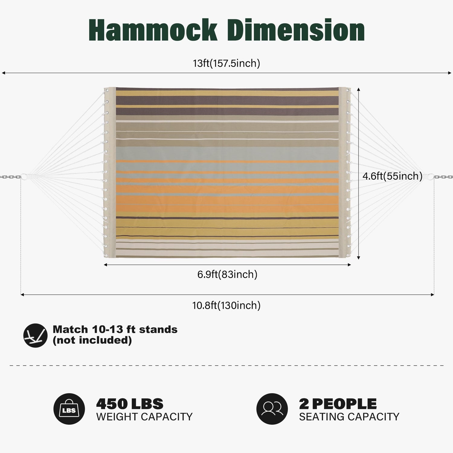 - Size And Weight Capacity: The Double hammock measures 83 inches x 55 inches, with a maximum weight capacity of 450 pounds. Complete with steel chains, the total length of the hammock spans 13 feet. Equipped with two adjustable, multi-link steel chains, you can customize the height to your most comfortable position without any concern of touching the ground