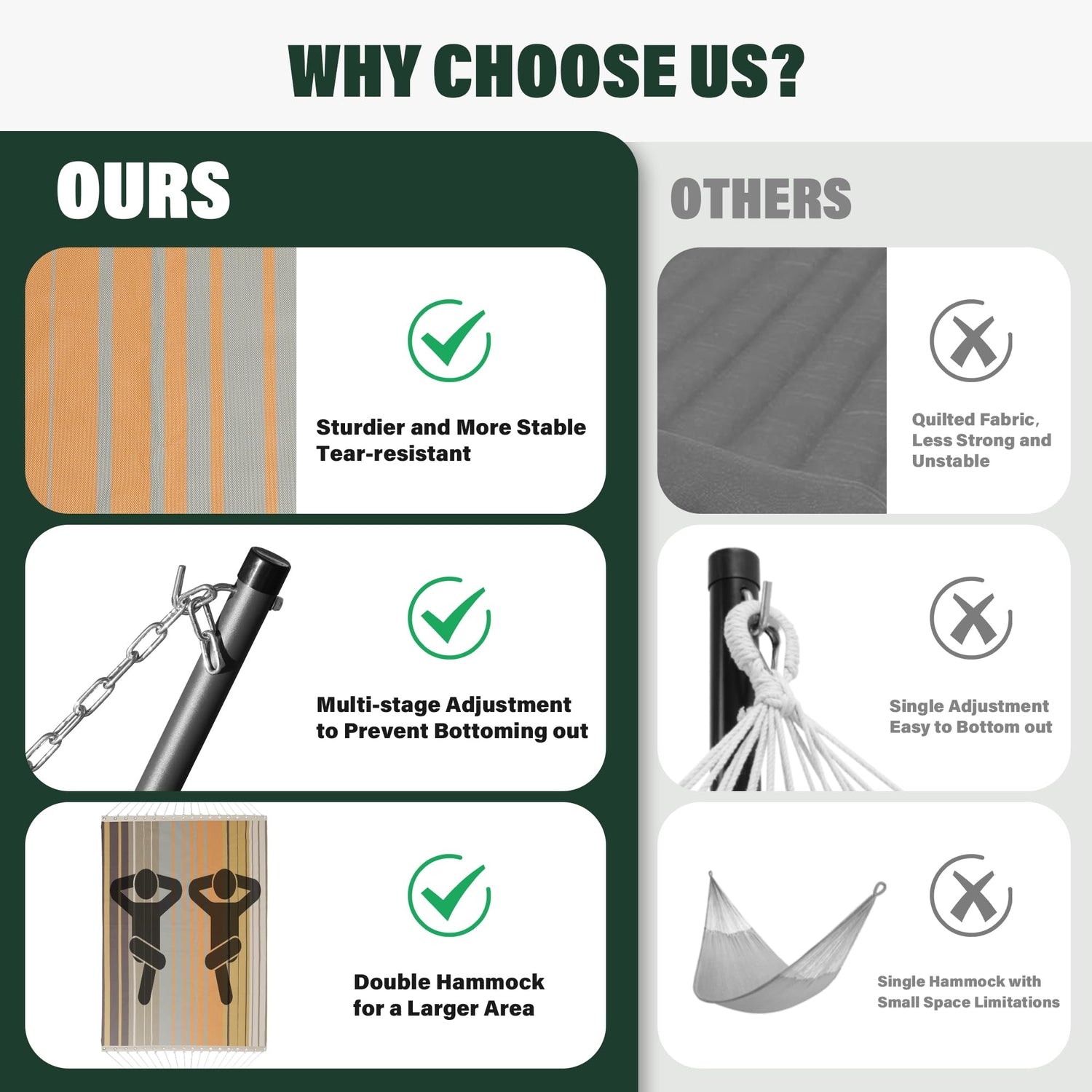 - Enhanced Ropes: Crafted meticulously by skilled hammock artisans, double hammock features 18 heavy-duty, thick ropes intricately woven and interconnected. This design not only boosts strength and durability, but also guarantees an uninterrupted and enduring hammocking experience